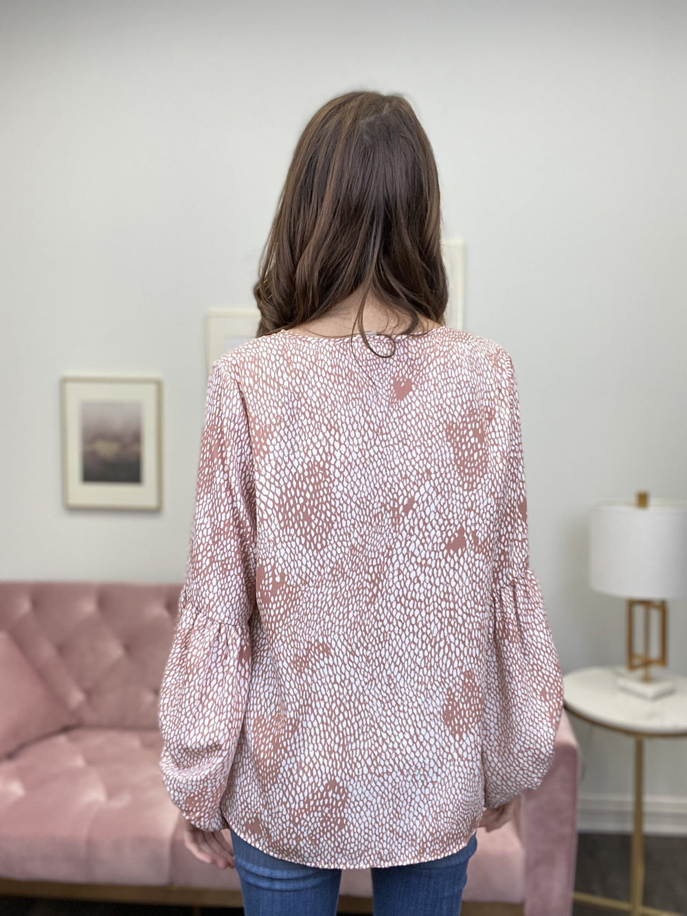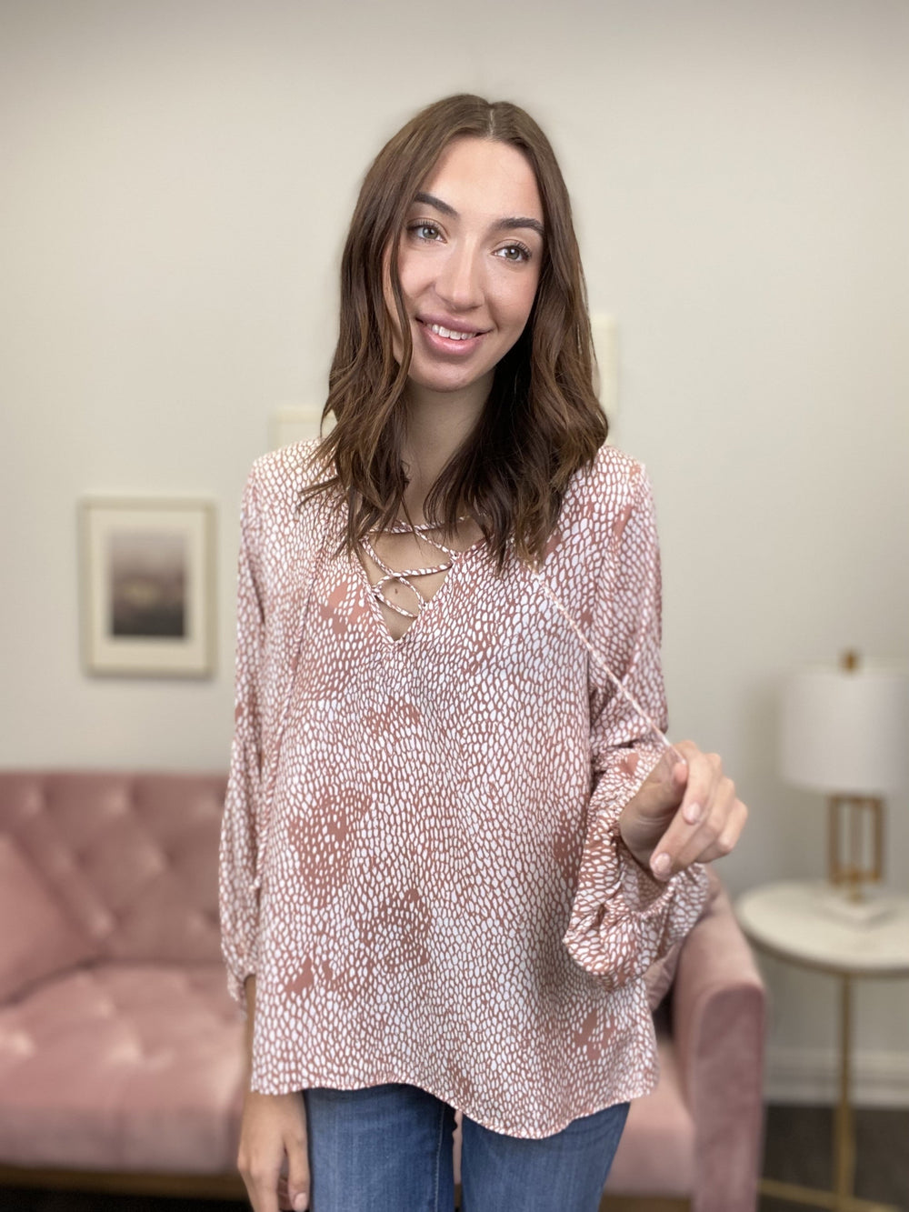 The Keep Pushing Top by Saints & Hearts will have you wanting to buy multiple of one top! This elastic puffed sleeve features a V-neckline with criss cross self tie detail, straight hemline, and an animal print style pattern. Grab it up before it's gone!