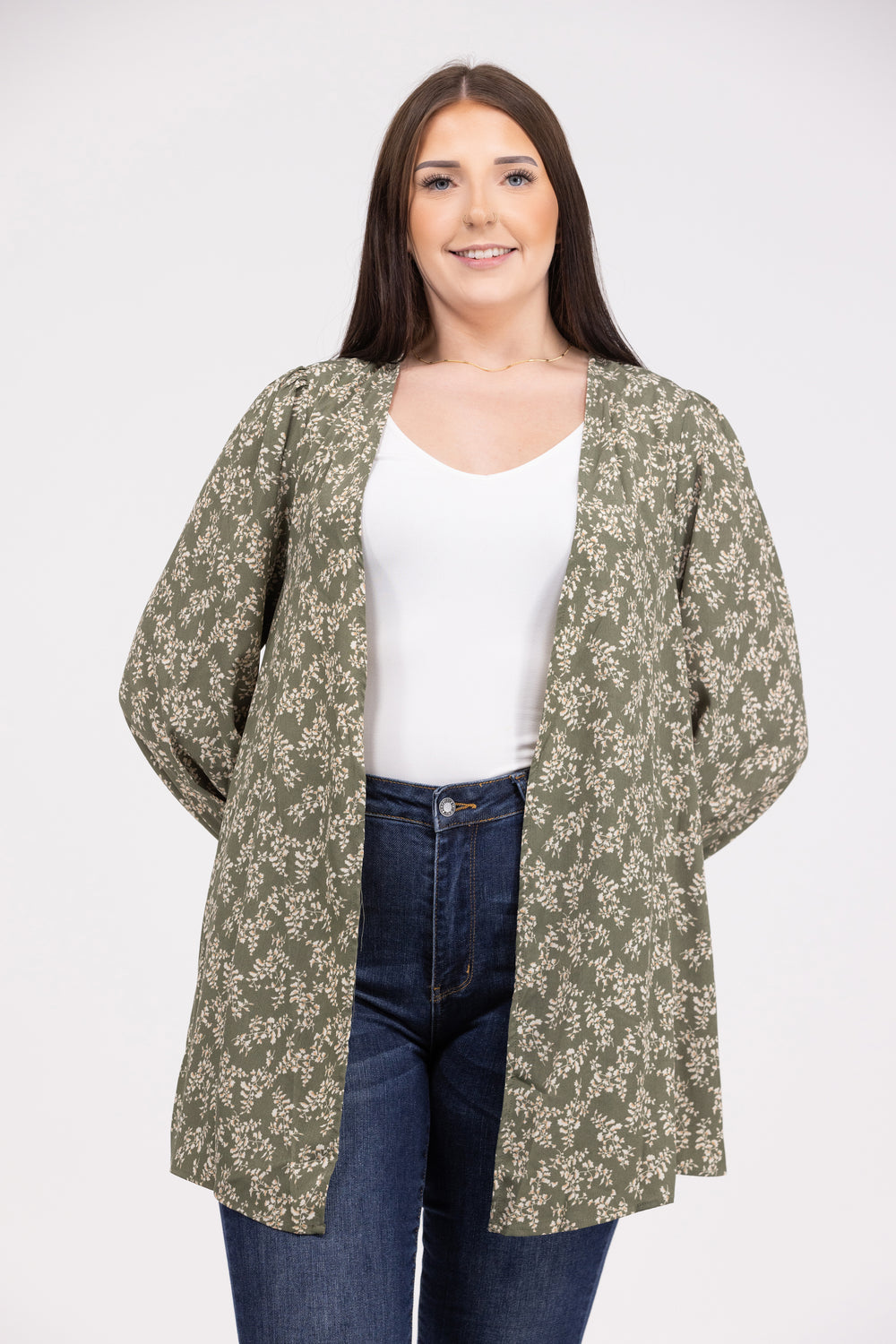 The Keep The Chill Off Kimono by Co. is a light weight open kimono cardigan. It has a beautiful floral print with balloon sleeves. It features straight hemline and an open front. Layer with this kimono to Keep The Chill Off!