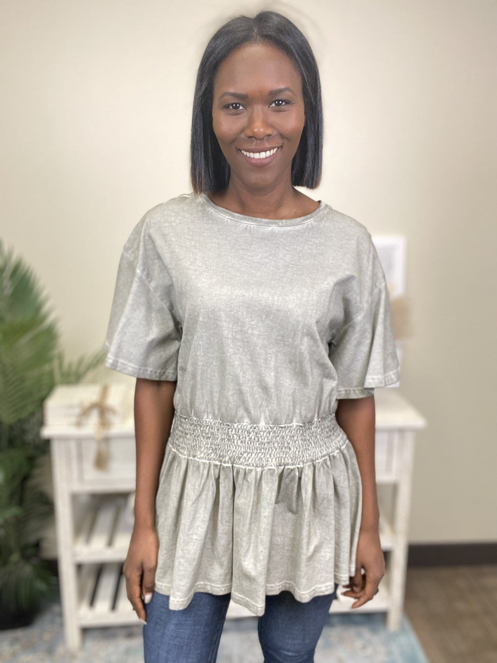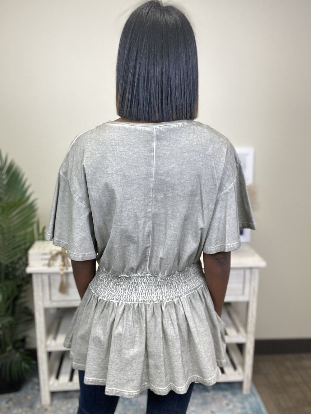 Kindness Wins Top by Easel is an Oil Washed top, with a rounded neckline, a drop shoulder, short bell sleeves, and a smocked waistline. This top goes best with your favorite pair of leggings.