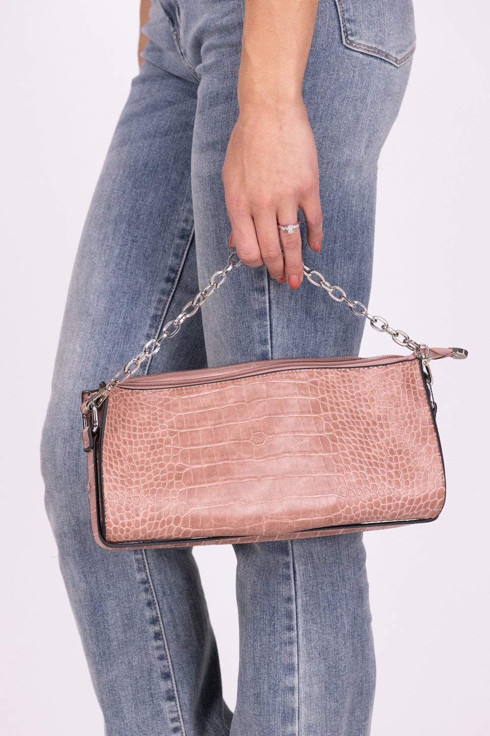 Trendy baguette-style bag with detachable chain strap. Small and stylish, but has plenty of room for all of your essentials!