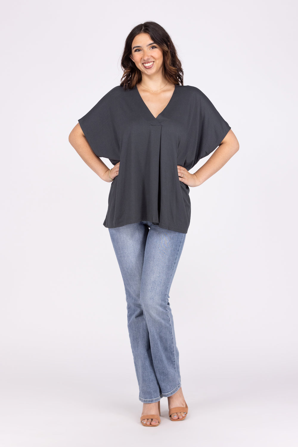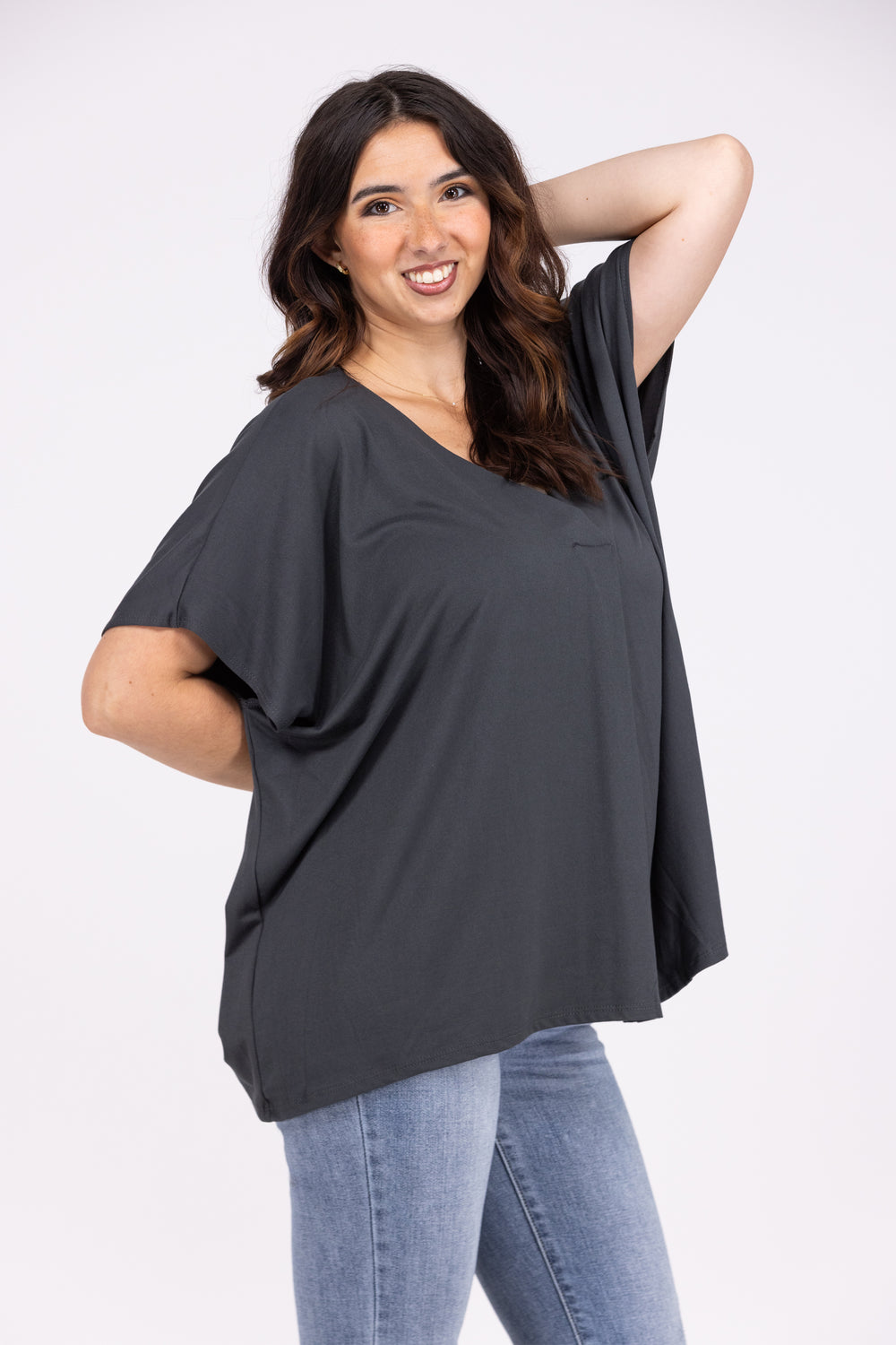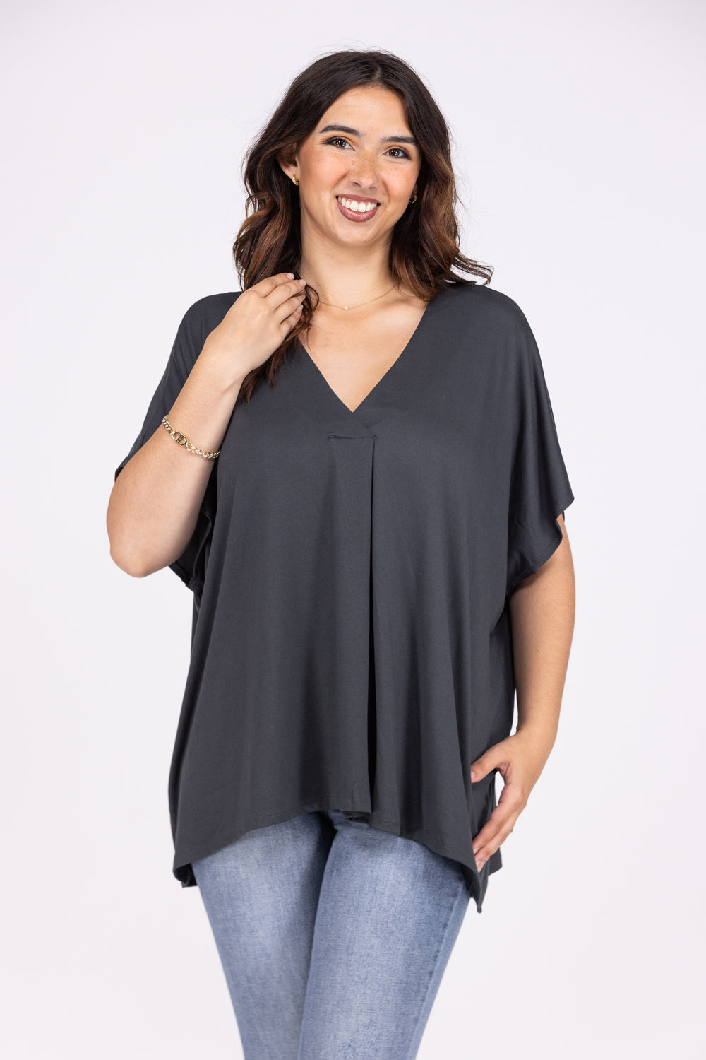 The Left Wondering Top By Entro is a solid drop shoulder top featuring dolman sleeves, V Neckline with a flattering front pleat and a straight hemline. This top has a soft fabric and a relaxed loose fit.