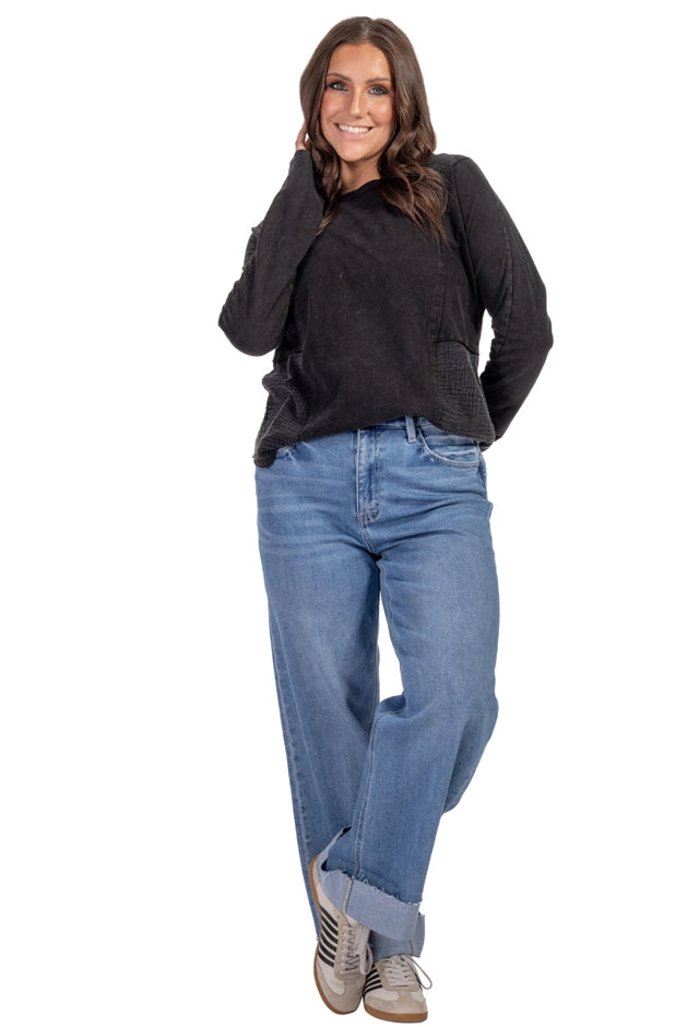 Our Women's Modern Long Sleeve Top from Heyson will have you looking for an excuse to throw a party! This long sleeve top features dolman style sleeves, contrasting fabric details near hemline, a round neckline, and a round hemline. This Women's Modern Long Sleeve Top can be worn with your favorite leggings or denim!