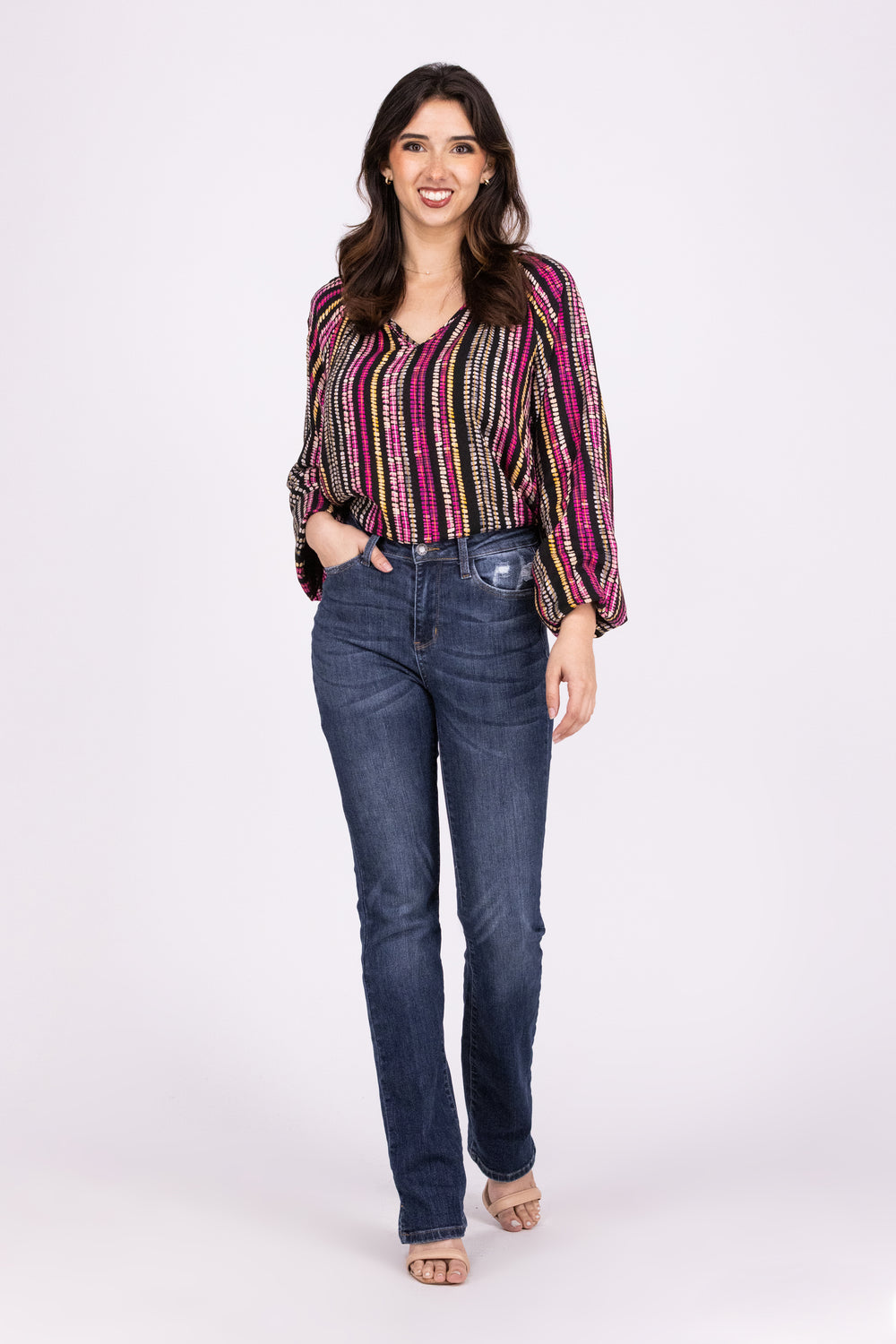 We love an easy, classic, blouse like this one! The Lights Off Top features a colorful print with balloon sleeves, elastic cuffs, and a V-cut neckline. Non sheer and woven with an oversized fit, the Lights Off Top will add a burst of color into your life and into your wardrobe.