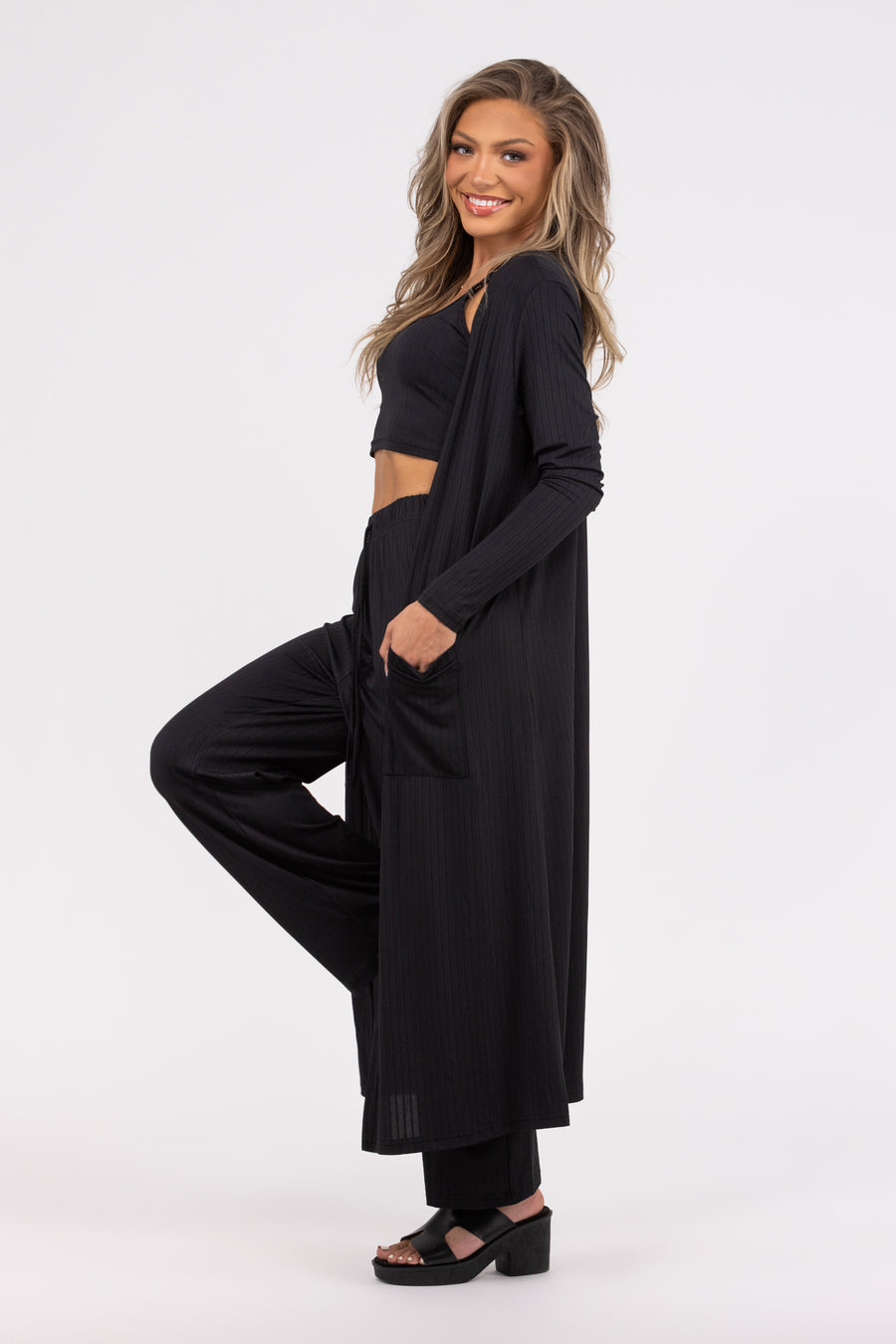 Relax like royalty in the Linden Luxury Lounge Set from WLM. The tank, pants and cardigan feature a soft, breathable fabric and a ribbed pattern. The pants feature a wide-leg, elastic waistband and a non-functional drawstring. The cardigan is long sleeve and has front pockets. Wear together or mix into different outfits. Enjoy your relaxing day in this lounge set!