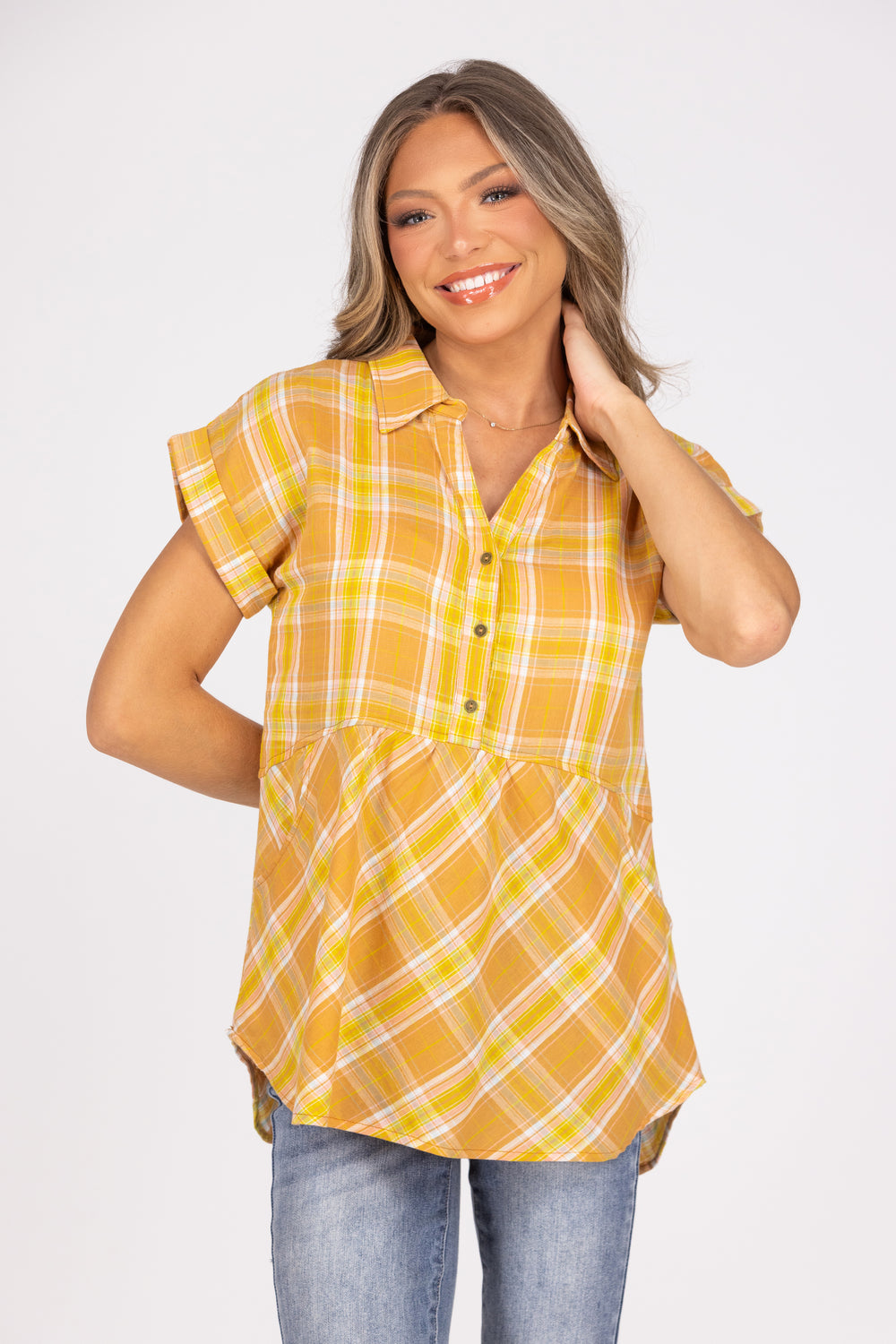 The Live Tonight Top by Heyson features a collared neckline with half button up, short cuffed sleeves, round hemline, pockets, and baby doll silhouette! Pair this shirt with leggings or denim for a truly cute summer look!