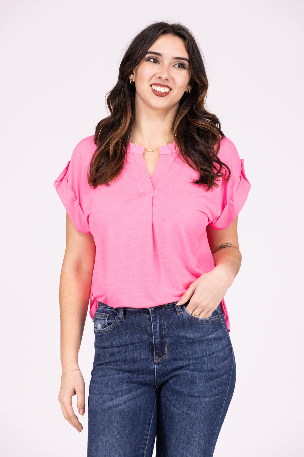 This Dolman Top from Dear Scarlett will make you feel like you're at a beach party! This solid top features a China collar, split neckline, short sleeves with tab detail. It is perfect to pair with your favorite denim or dress it up with your favorite bottoms for work.