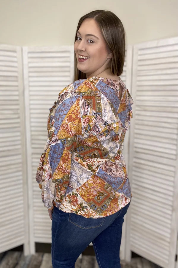 You have been eyeballing the Long Enough Top by Andree by Unit, time to buy it! This beautiful top features a round neckline with ruffled detail, long puff sleeves with elastic wrists, and a round hemline. The contrasting patterns gives this top lots of interest and excitement! Pair this top with dark denim for a easy look!