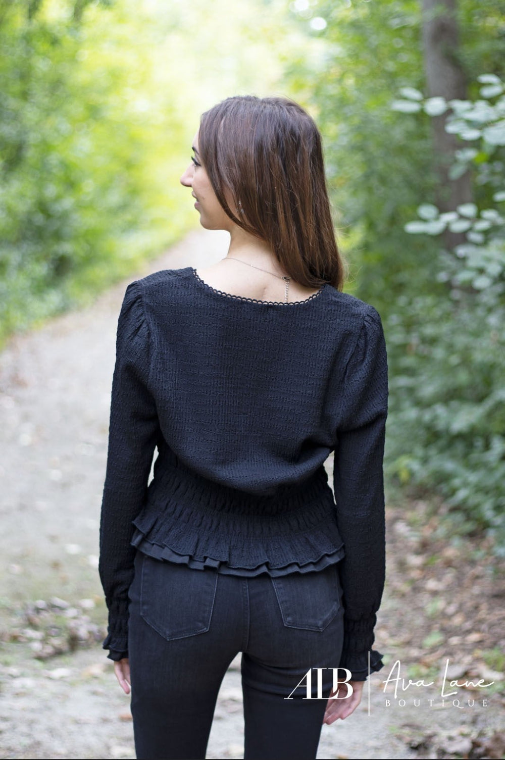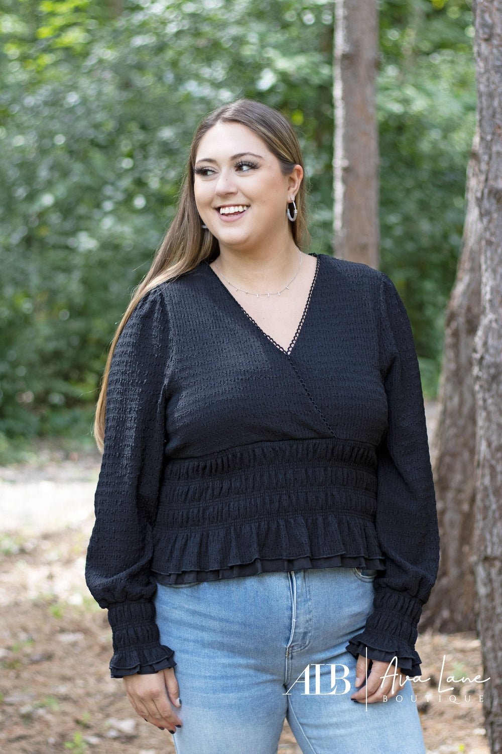 The Make Or Break Top by White Birch is a long sleeve solid woven top with a surplice front featuring a smocked body and a ruffled hem. The fabric is a lightweight woven material. This top is great for a night out!