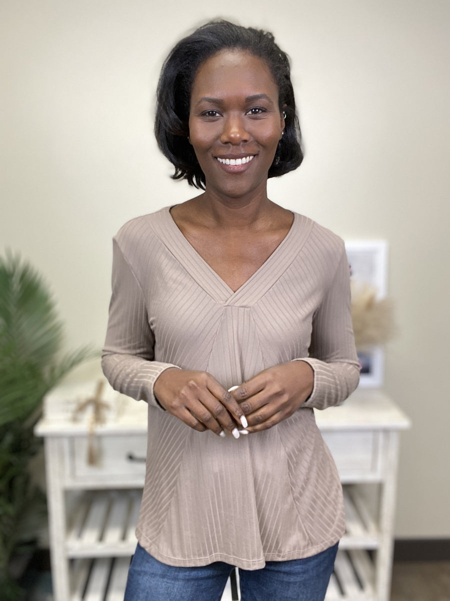 The Marry That Girl Top by White Birch is a long sleeve knit top that features a V-neck, ribbed fabric, diagonal seams, and a straight hemline. The Marry That Girl Top is an any occasion top that can be worn many ways. Dress it up with a skirt or down with your favorite denim.