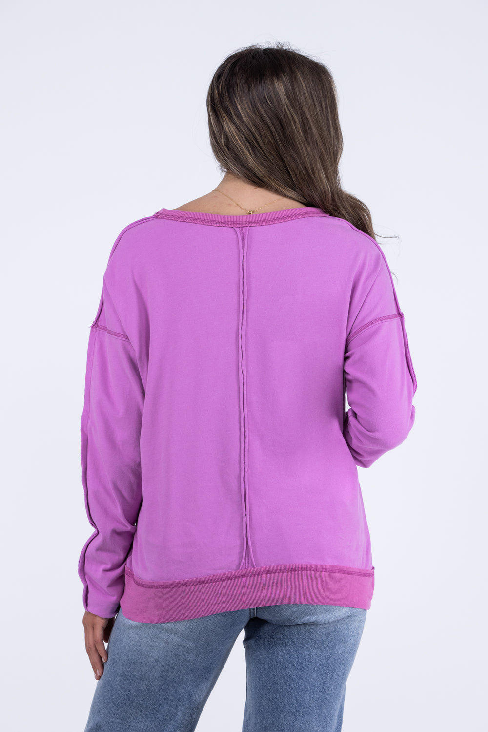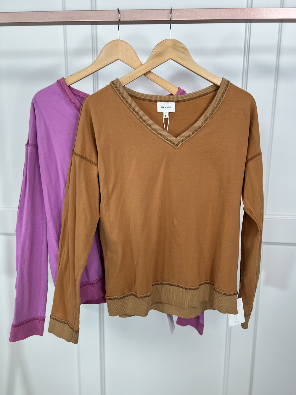 This top features a straight fit bodice, a v-neckline, exposed seam on the backside and ribbed hem and neckline details. This top is a perfect layering piece to go over a button up shirt and denim to add some depth to your look!
