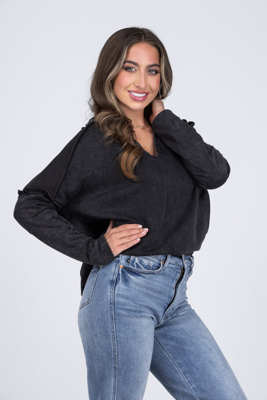 Meet comfort and style halfway with the Meeting Halfway Long Sleeve Top from Heyson! This lightweight top features flattering exposed seamlines, a split neck with a collar and stylish patchwork on the shoulders. This top is perfect for a casual night with friends or family! Pair it with a comfy pair of leggings or a light wash denim to complete the look!