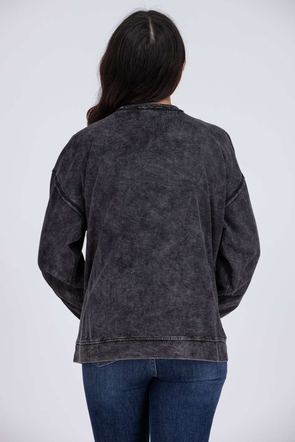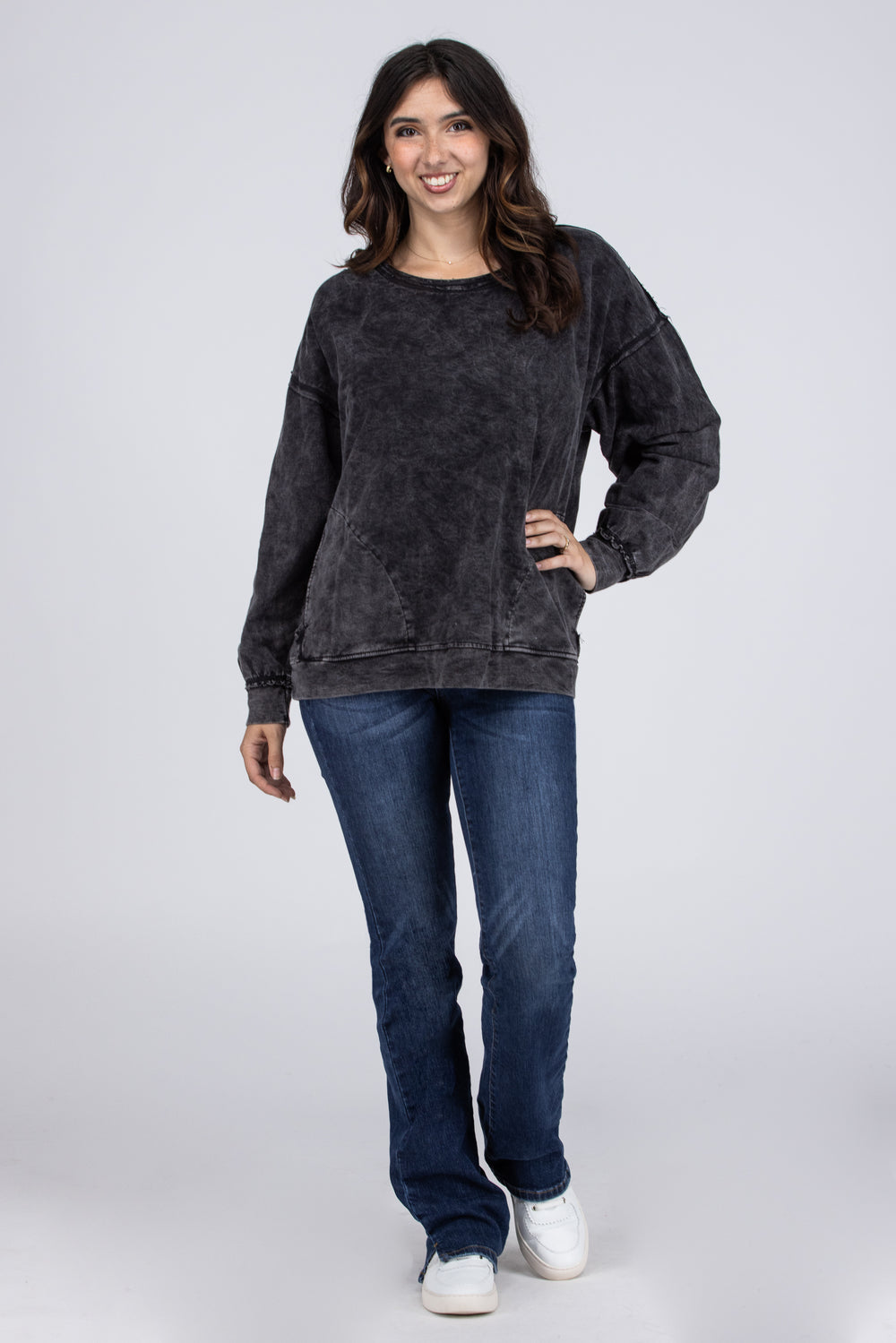 The Merry Midnight Sweater by Bibi has a vintage washed look to it, but with updated elements! It features a round raw edge neckline, long cuffed sleeves, two front pockets, and a straight banded hemline. This sweater is perfect to go with your punk style shoes, or with your comfy joggers!
