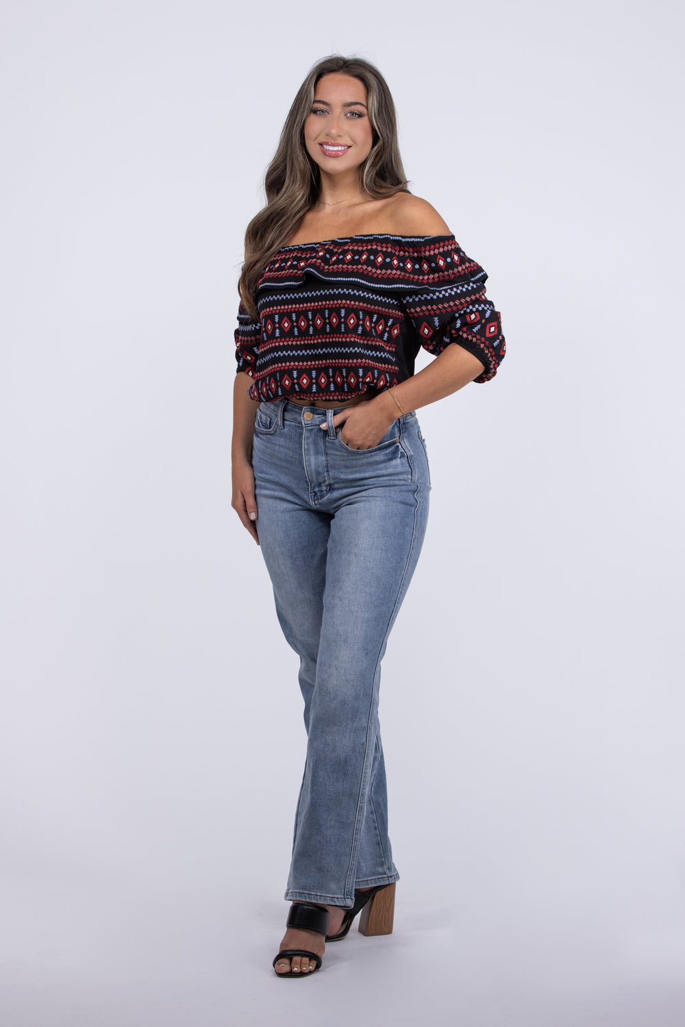 The Midnight Romance Top from Andree by Unit is the epitome of romance! The delicate Savanna Jane embroidery, off the shoulder design, ruffled details and an elasticated cropped hemline create an alluring and feminine look that is perfect for a romantic dinner.