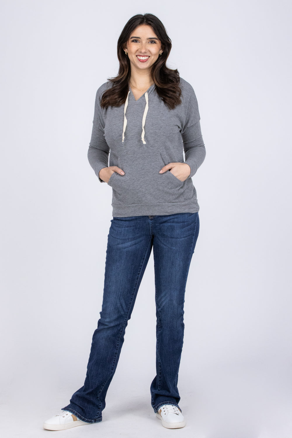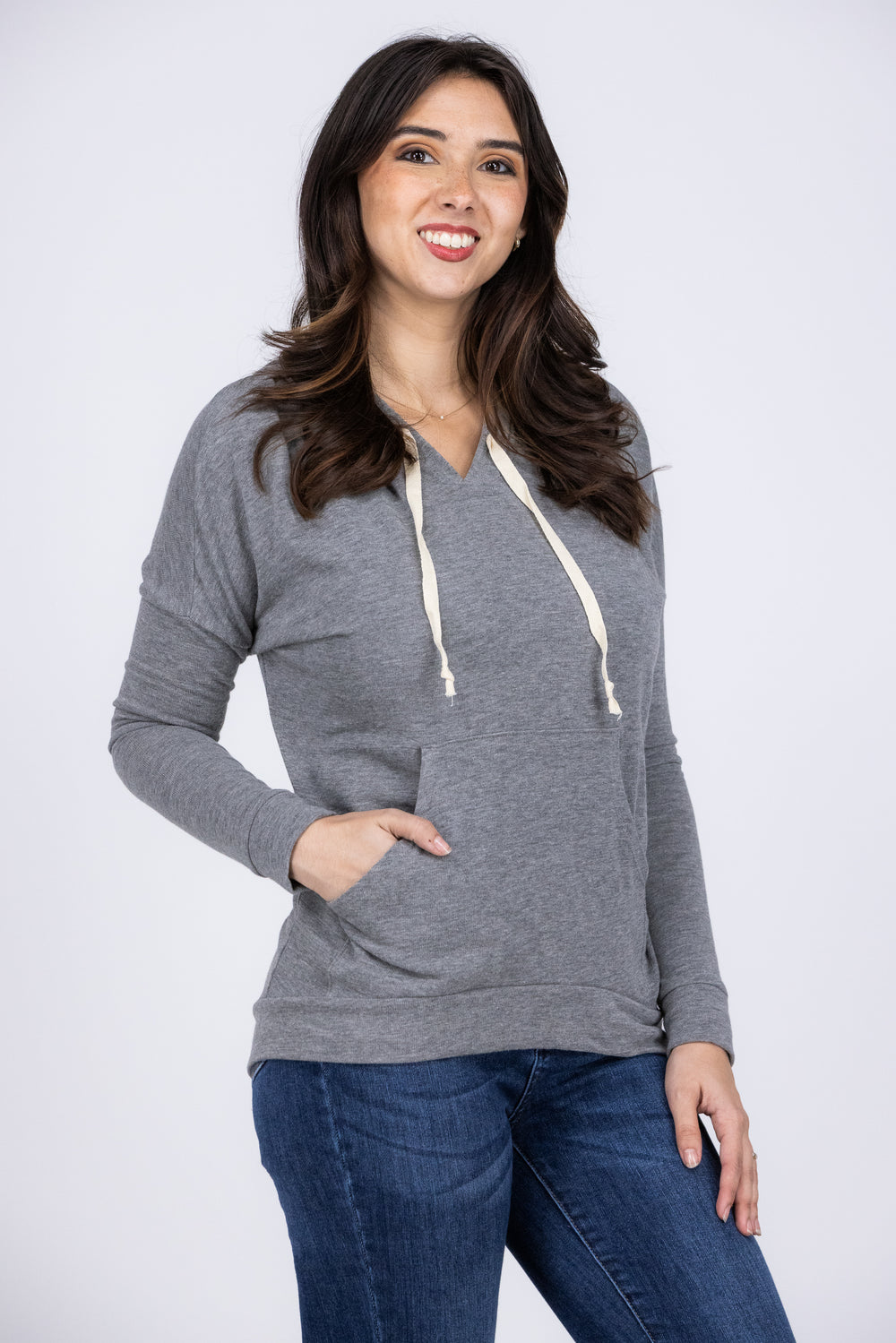 Get ready! This lightweight hoodie is longer in the back! The Mine Please Top by Enti Clothing features a functioning drawstring hood, front pocket, high-low straight hemline, and comfy loose fit. Perfect for all your leggings!
