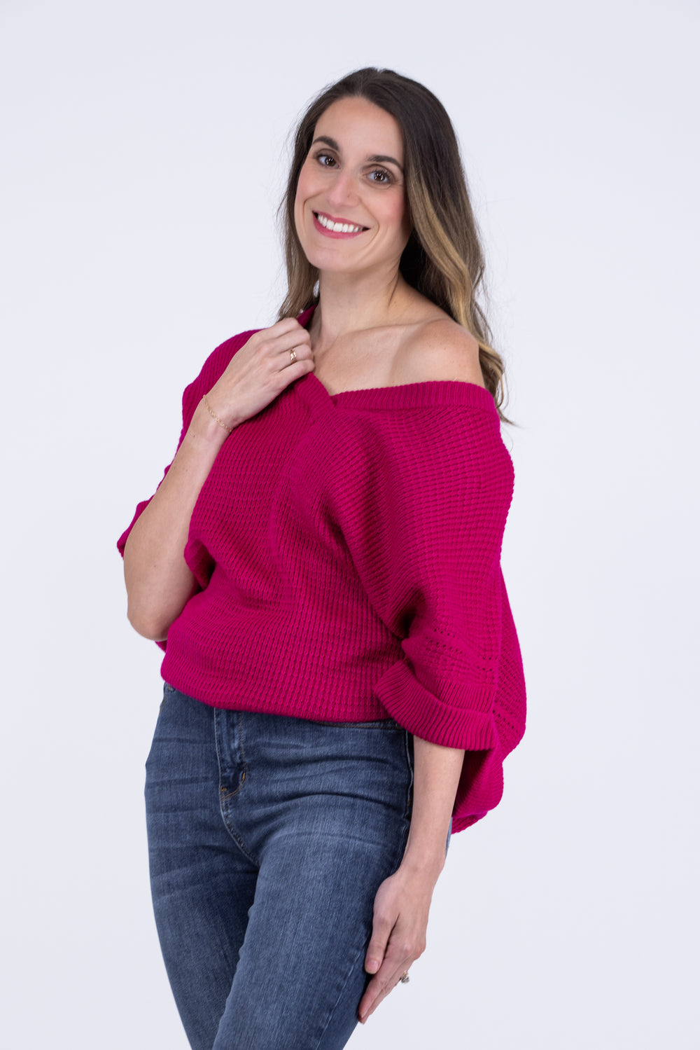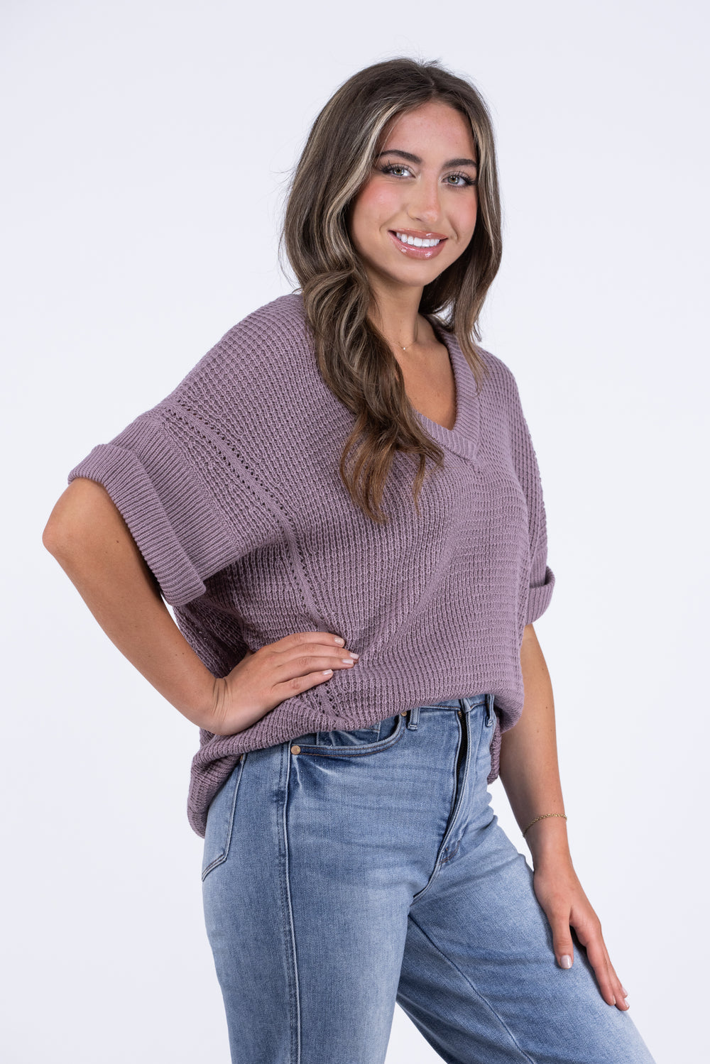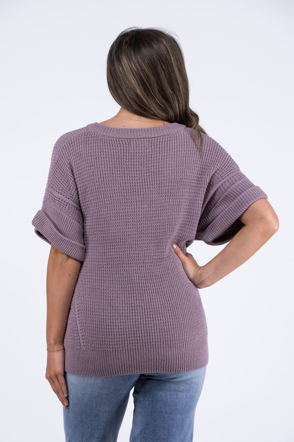 The Muted Messages Short Sleeve Sweater from Andree By Unit is great for getting together with friends. It features a V-neck, a ribbed knit design on the collar, cuffs and hem, rolled cuffs, a seam design on the front to flatter you, and dolman sleeves. Pair with dark denim and boots for a fashionable look for going out.