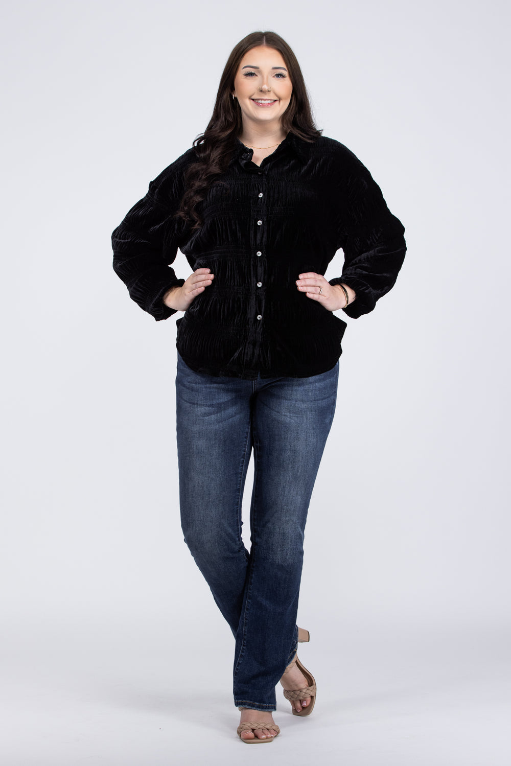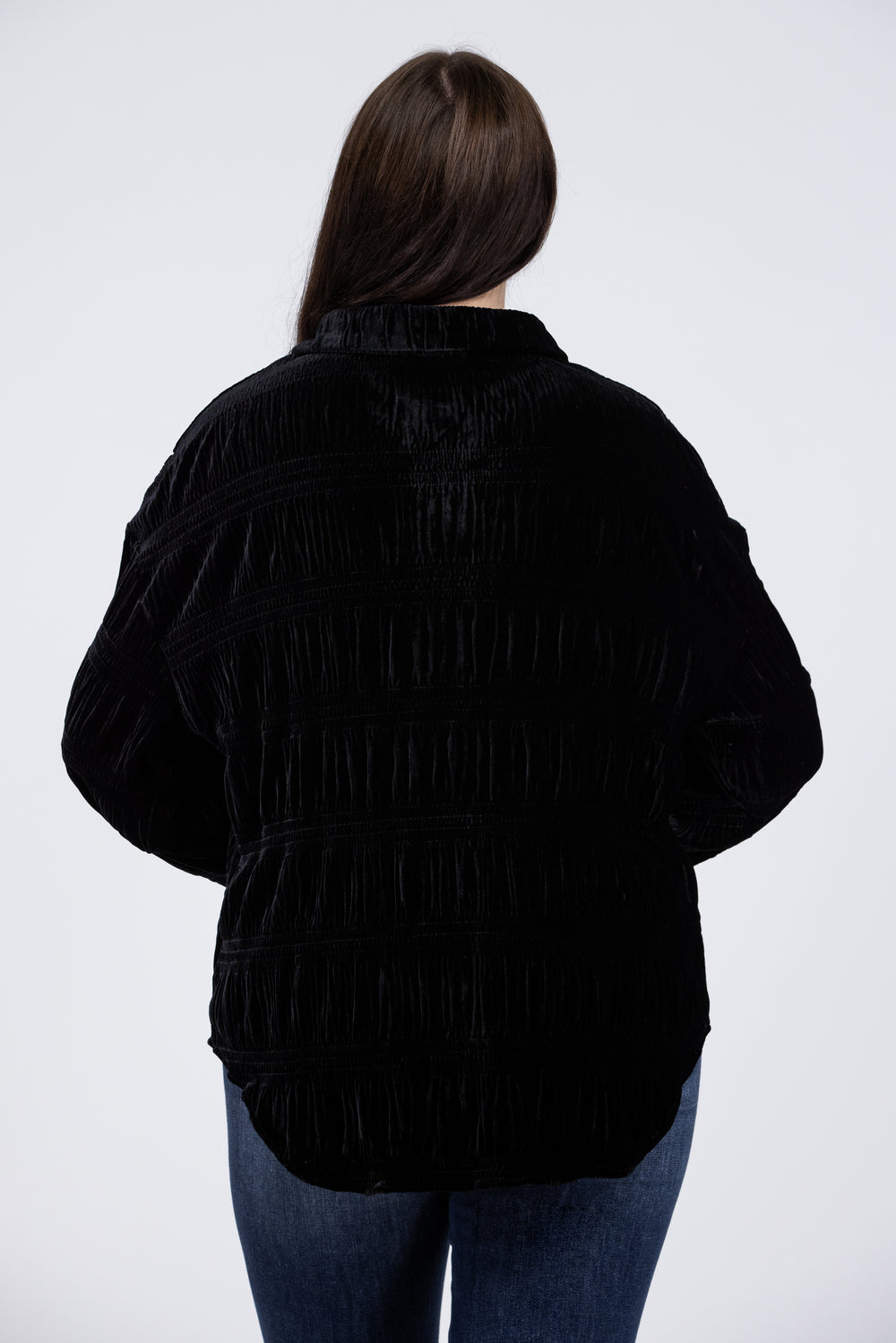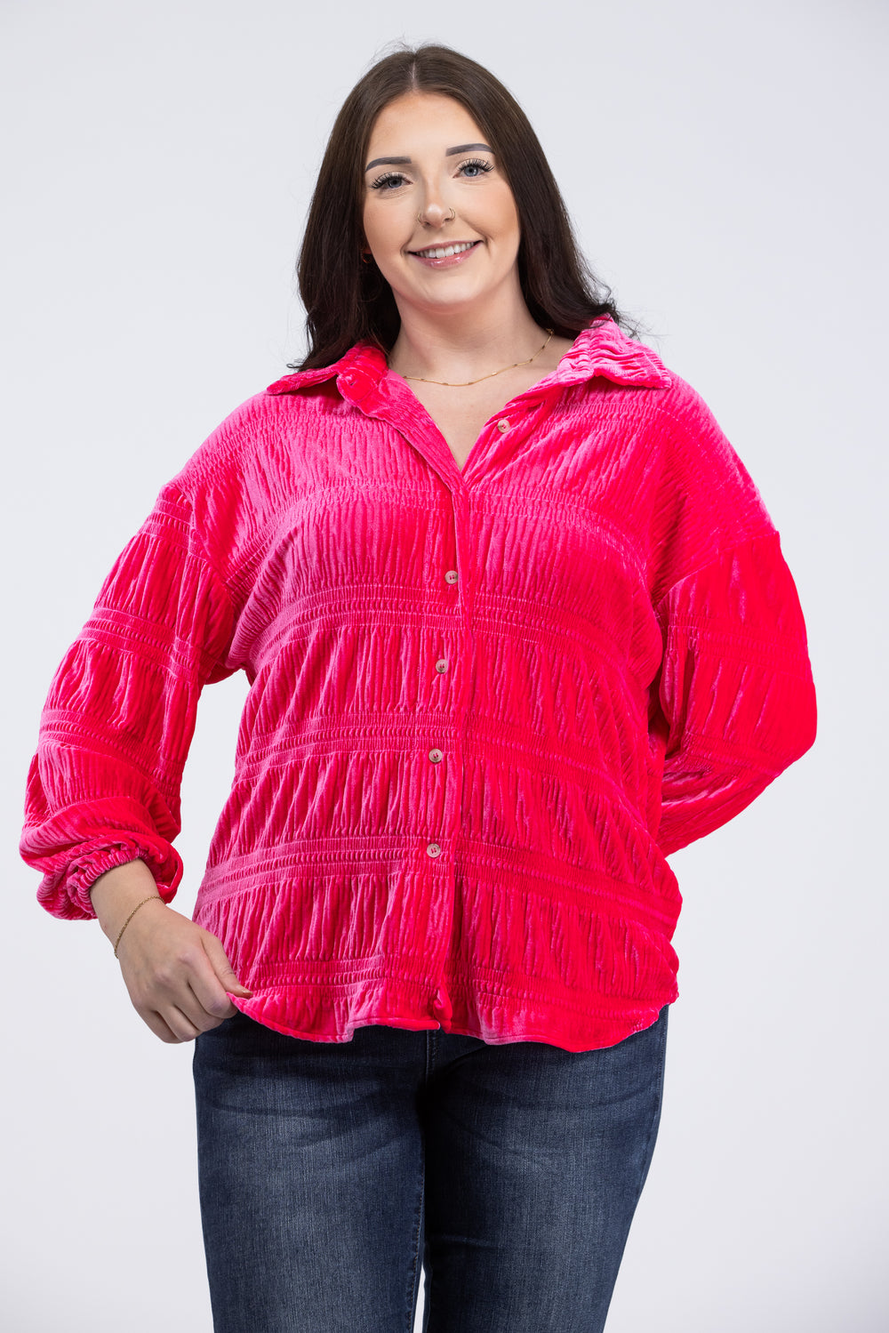 The My Favorite Song Top from White Birch is sculpted from a ruched velvet into a classic style to keep it looking laid-back yet elegant. The ruched bodice is shaped with a collar and long balloon sleeves, finished with a button-down front at the center. Pair this adorable top with our "Hot Pants Leggings" or any faux leather leggings and booties.