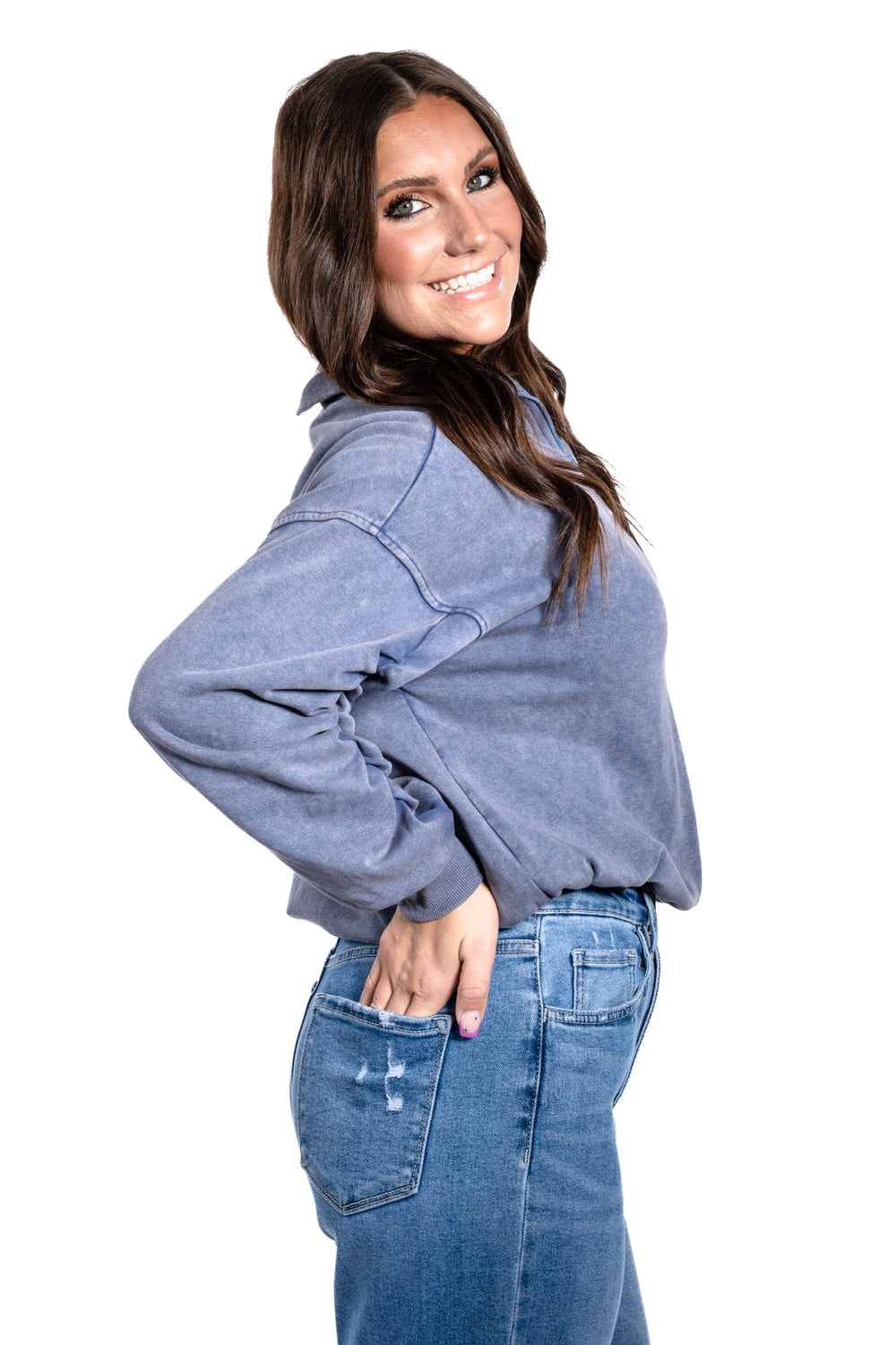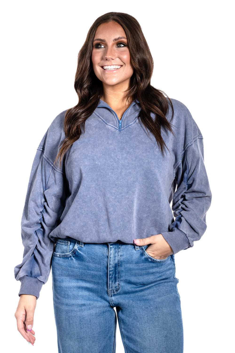 Bring joy to your life in this Half Zip Pullover Sweatshirt from Heyson! Made with a high neckline, half zip front, drop shoulders and long sleeves with gathered cinched detailing. This top has a slouchy silhouette that boasts an oversized loose fit. The hem is finished off with elastic cinched detail. Pair with your favorite denim or our "Grounded Warrior Leggings" and our "Comfort Bootie" for a more laid back look! The unique color of the pigment vintage wash is achieved through a special dye and washing process. Results vary from one another, creating a unique and natural variance in texture, distress, and shade. Yours is truly one-of-a-kind. These are intentional and not defective.