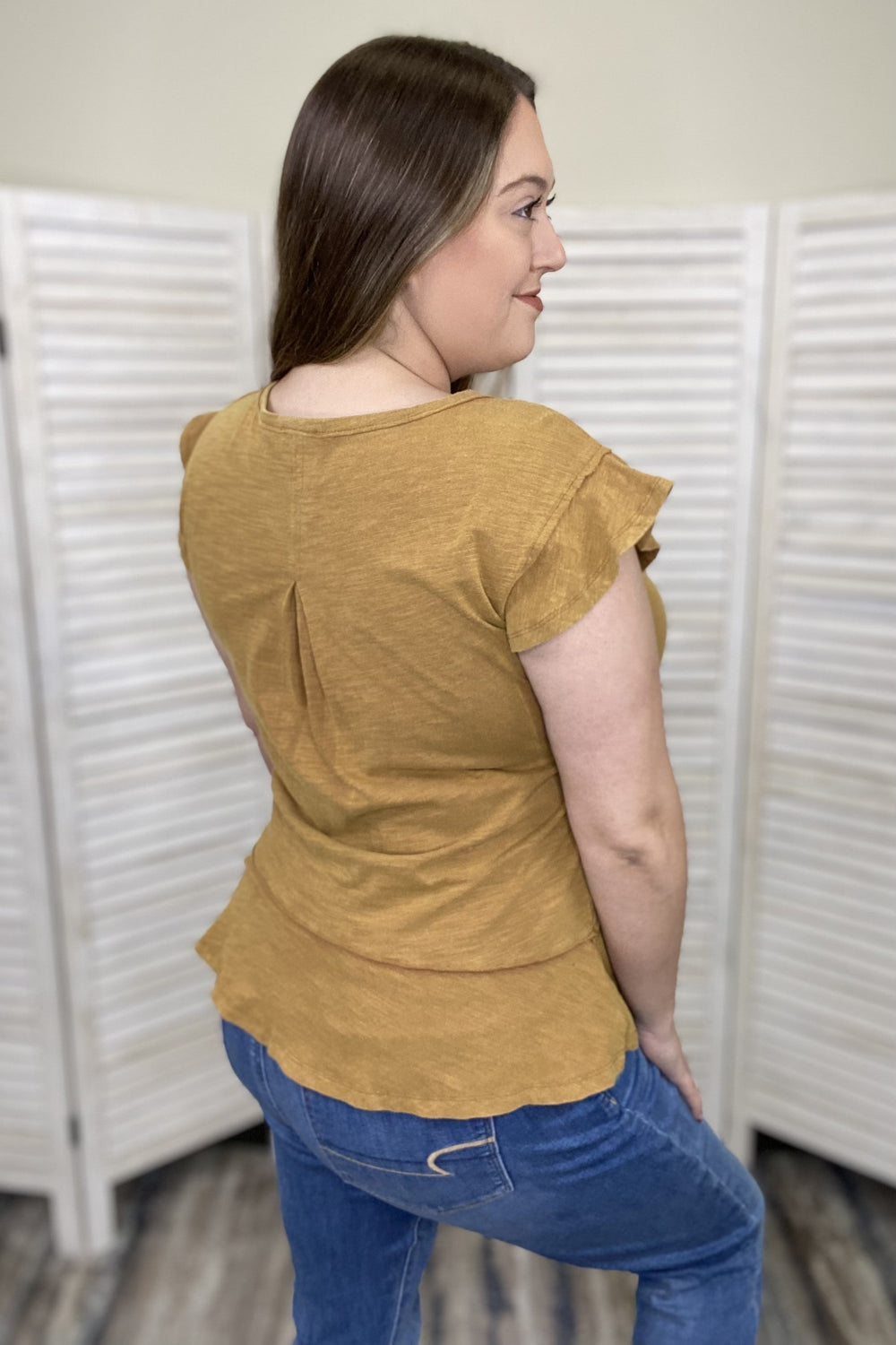 The My Personality Top By Doe & Rae is a washed extended ruffle sleeve tee featuring pintuck detail and a round neckline.