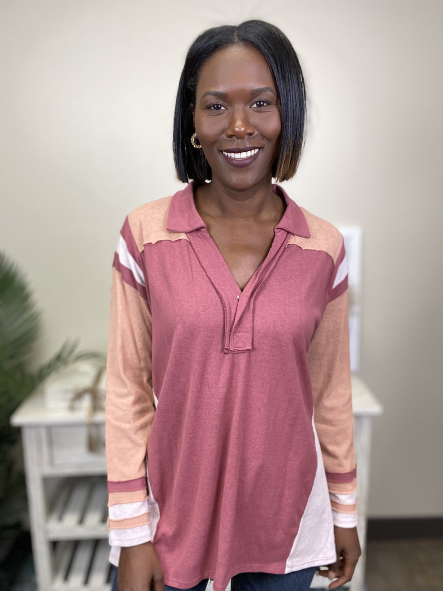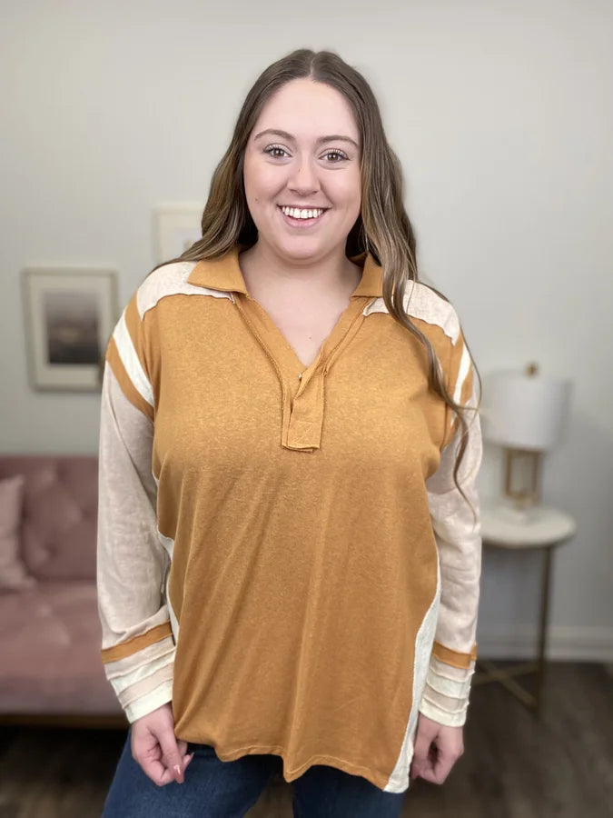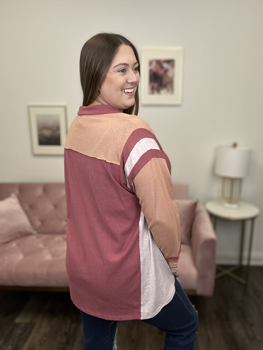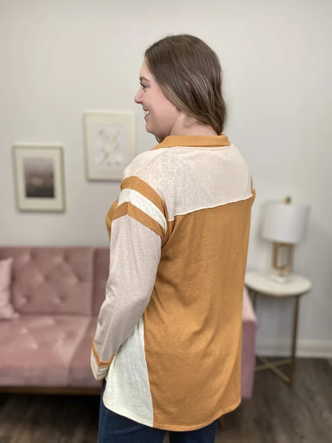 The Need To Be With You Top by Easel is the perfect mix of modern and vintage. It features many hints of color-blocking along with vintage varsity striped detail at the shoulder. The collar is V-neck shaped with a snap closure. The sleeve also has a striped detail at the cuff. The hem is straight in front but curved at back. This is a shirt you need for Sunday football!