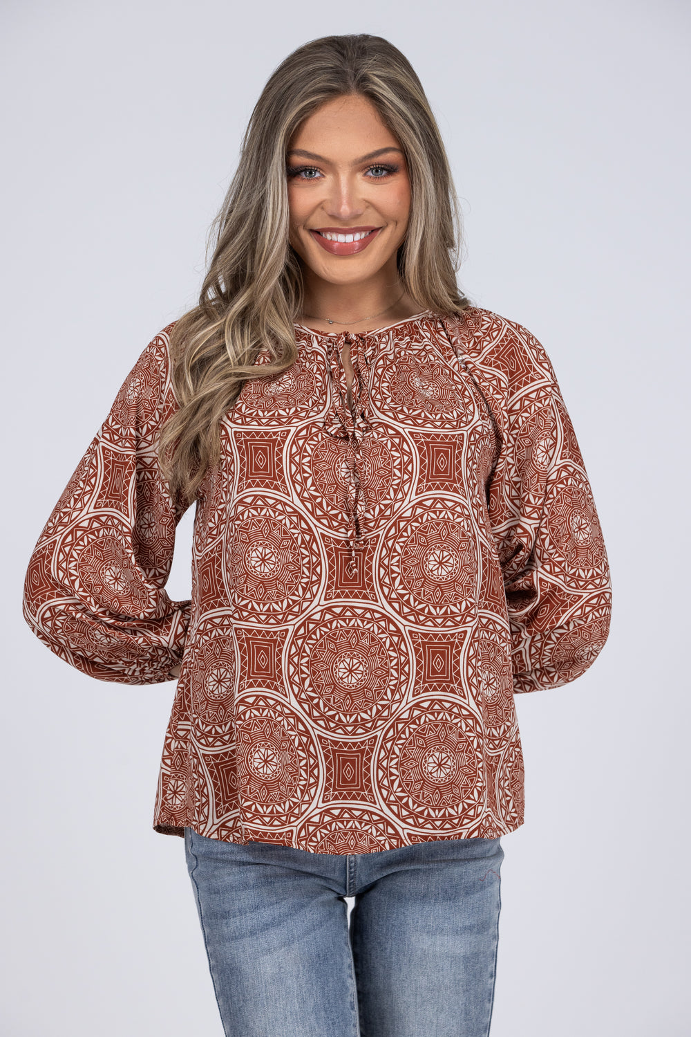 The Never Gonna Let You Go Top by Andree by Unit is that top that no matter how many times you clear out your closet it always remains! This lovely silky top features a round neckline with V-cut and self tie closure, 3/4 puff sleeve with elastic wrists, and a round hemline. The fabric has a beautiful and eye-catching pattern!