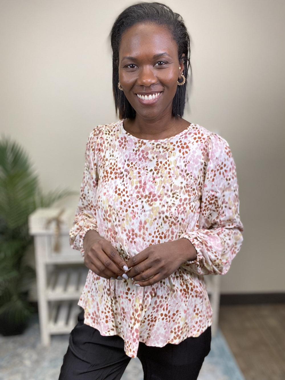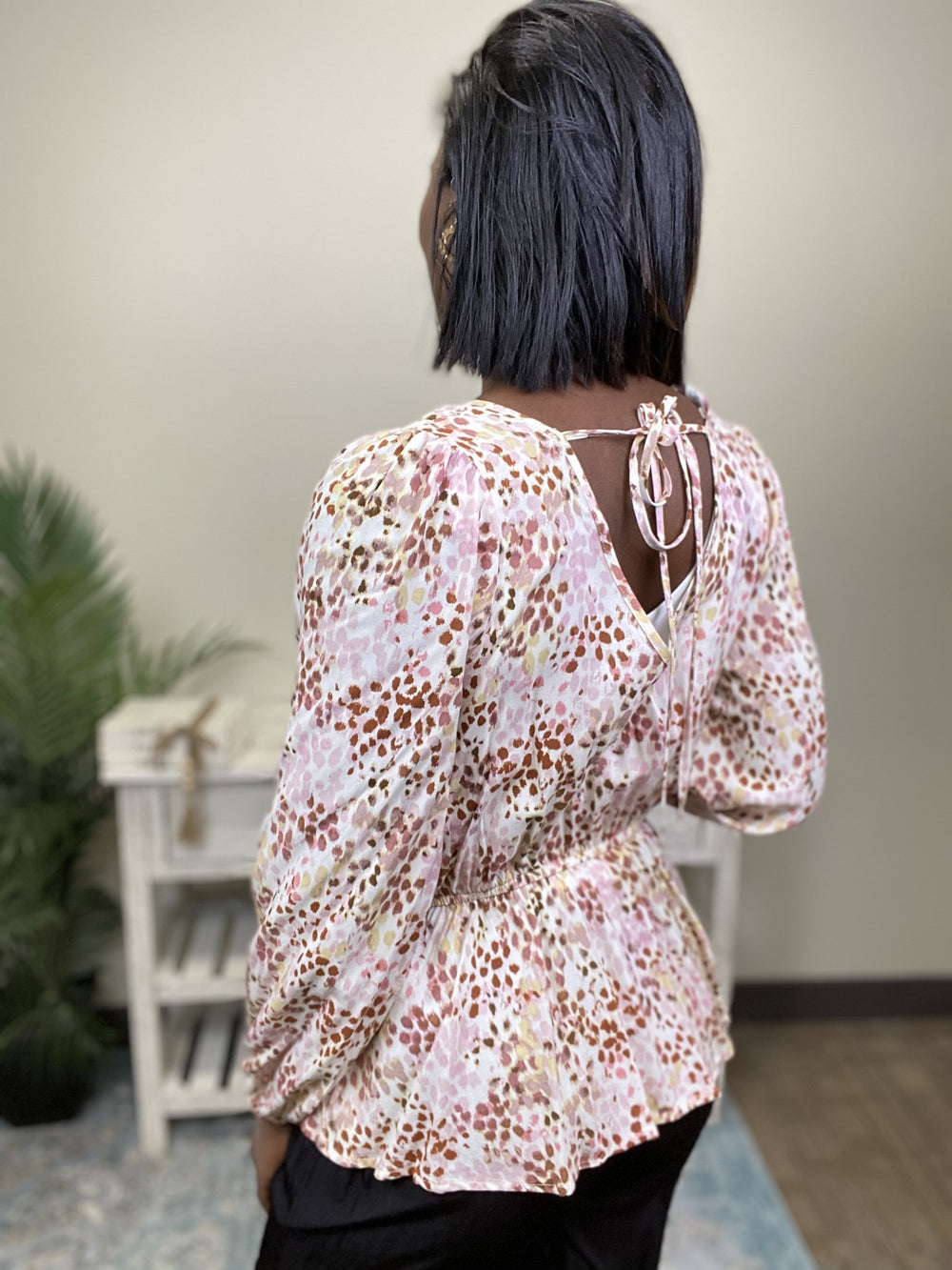 The Never Lost Top by Andree is a long sleeve top, featuring a rounded neckline with rear opening and tie, elastic cuffs, an elastic waistline, and a gathered front and shoulders. This top is super light with an airy feel and a fun floral print.