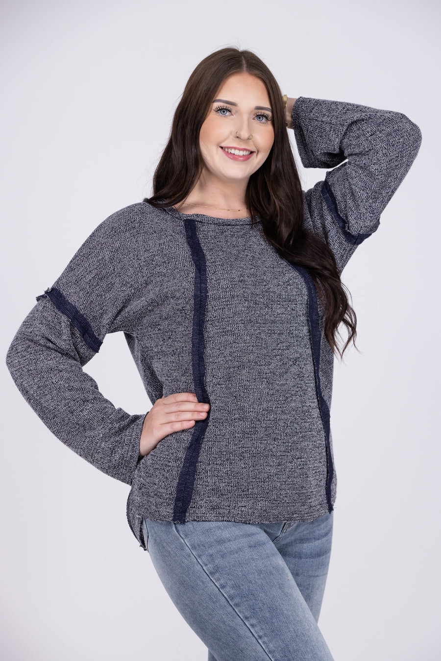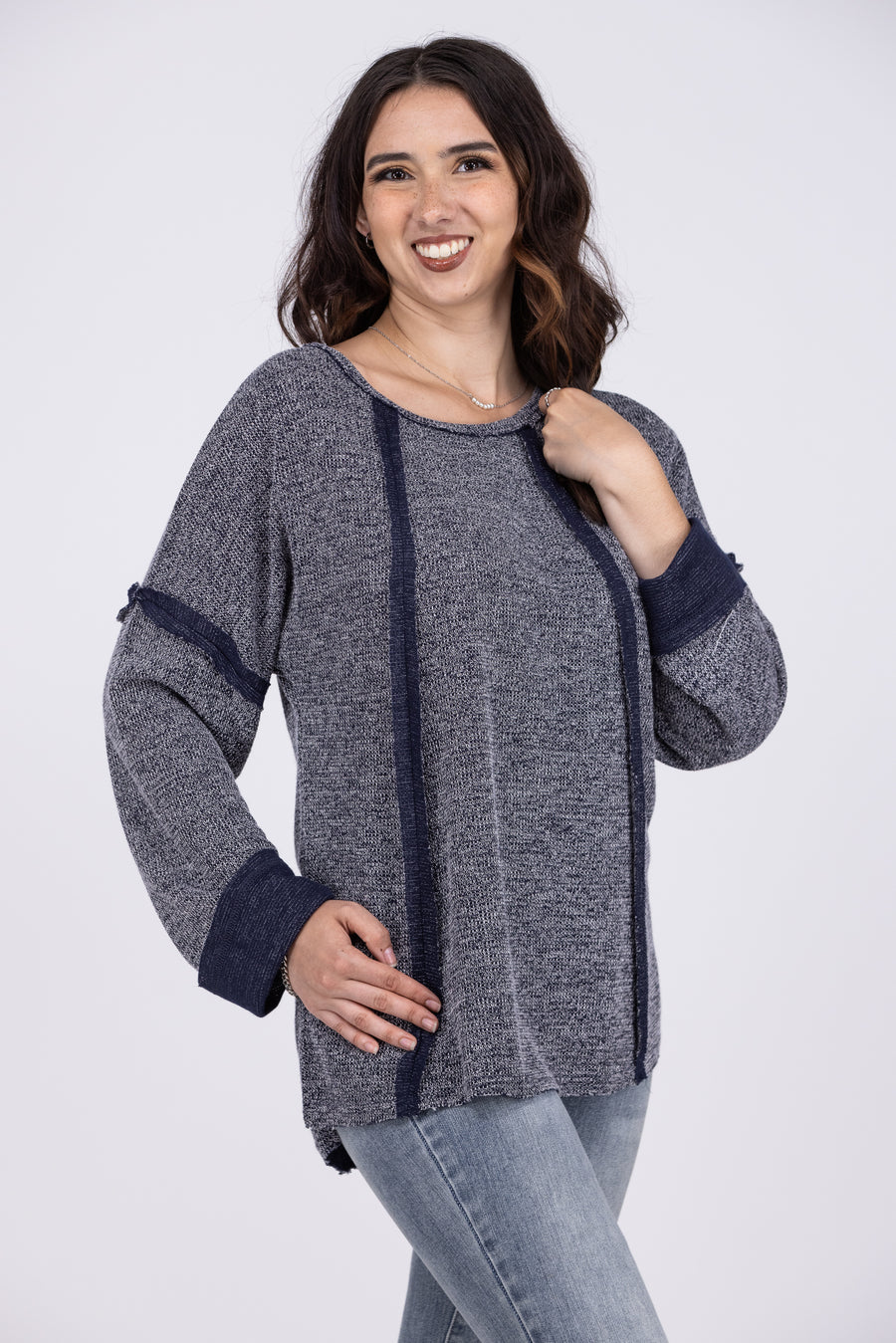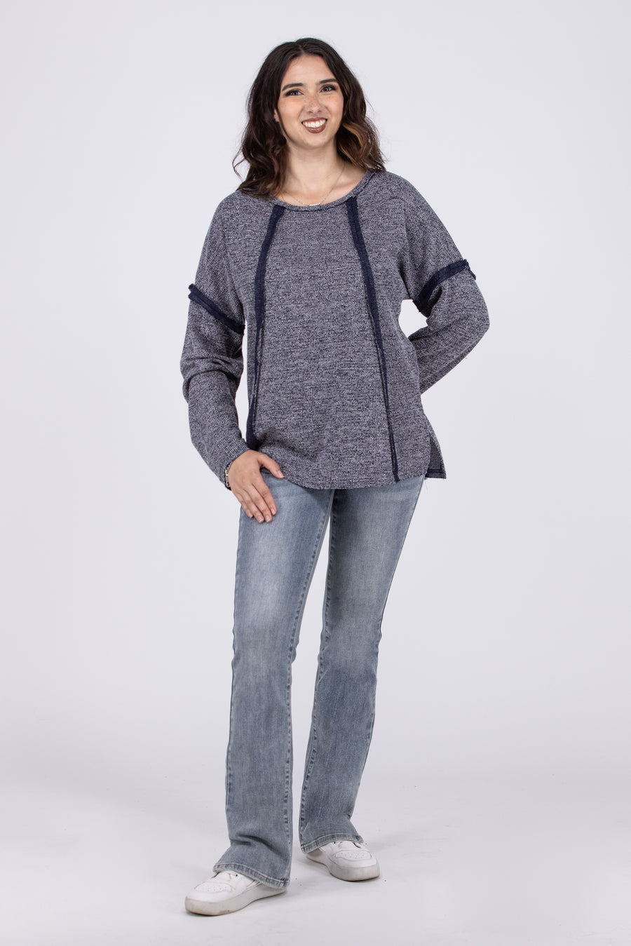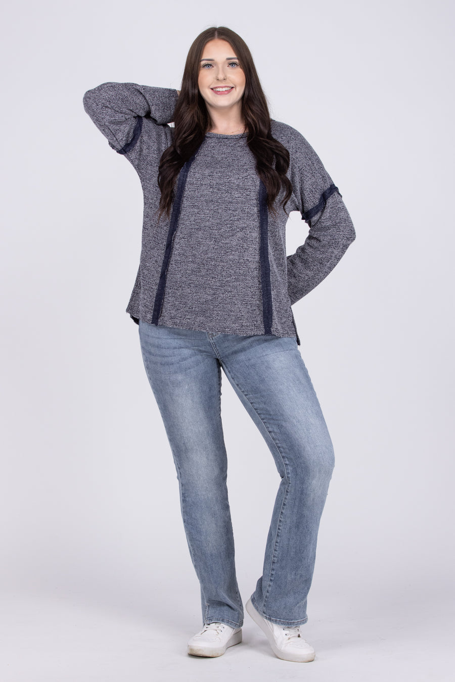 The Night Goes On Top by GiGio is a two tone waffle knit top, with long sleeves, a round neckline, and a hi-lo hemline with side slits. The Night Goes On Top is gives you a worn look with its rough edging and distressed accents. The Night Goes On top is very soft with a light feel that goes great with leggings, joggers, and denim.