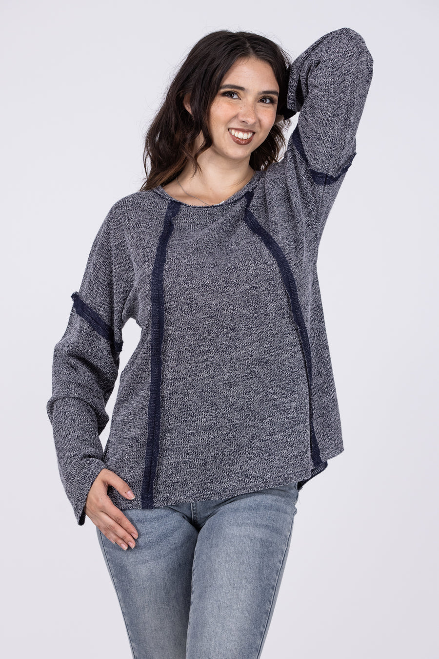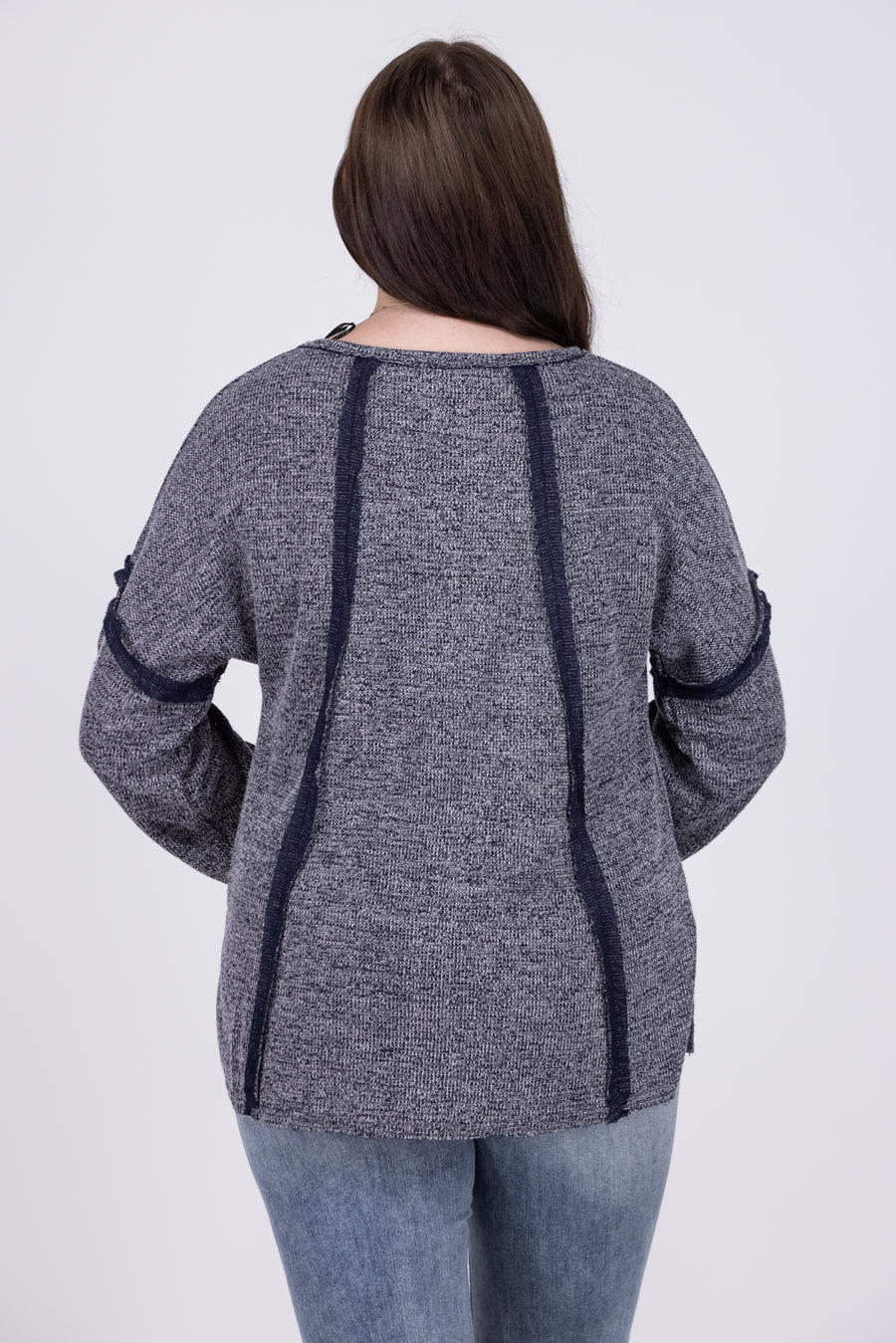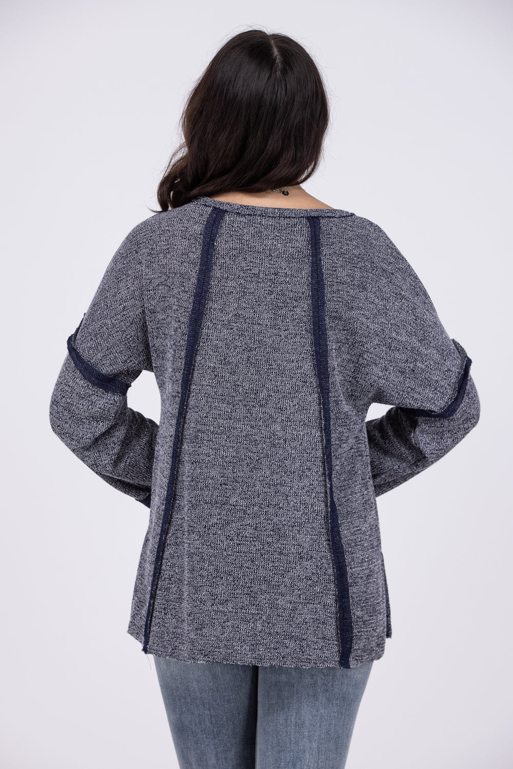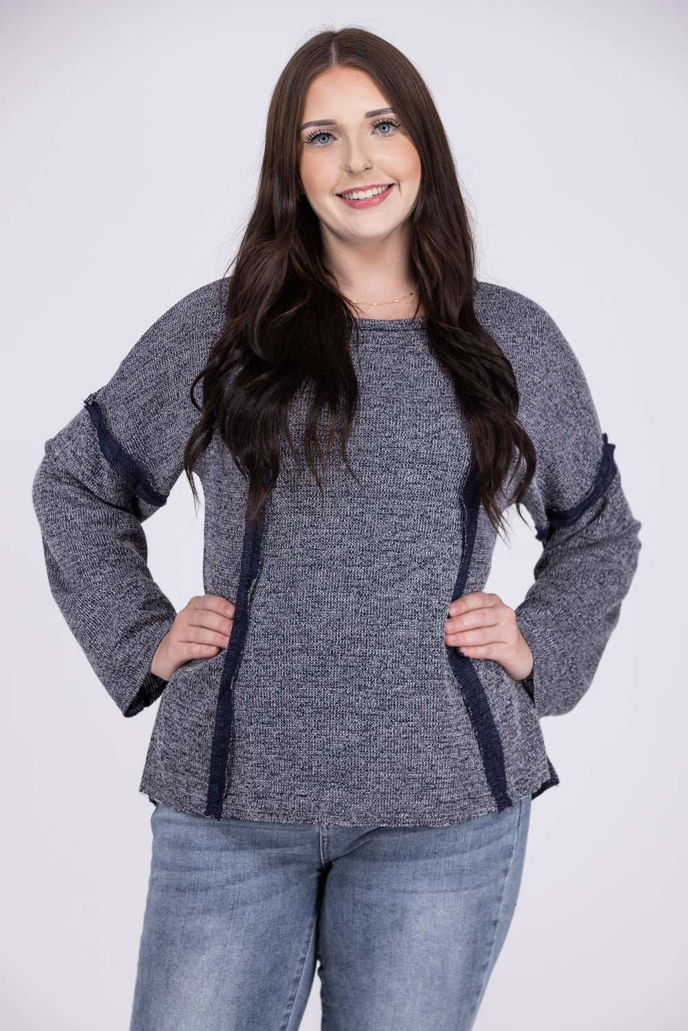 The Night Goes On Top by GiGio is a two tone waffle knit top, with long sleeves, a round neckline, and a hi-lo hemline with side slits. The Night Goes On Top is gives you a worn look with its rough edging and distressed accents. The Night Goes On top is very soft with a light feel that goes great with leggings, joggers, and denim.