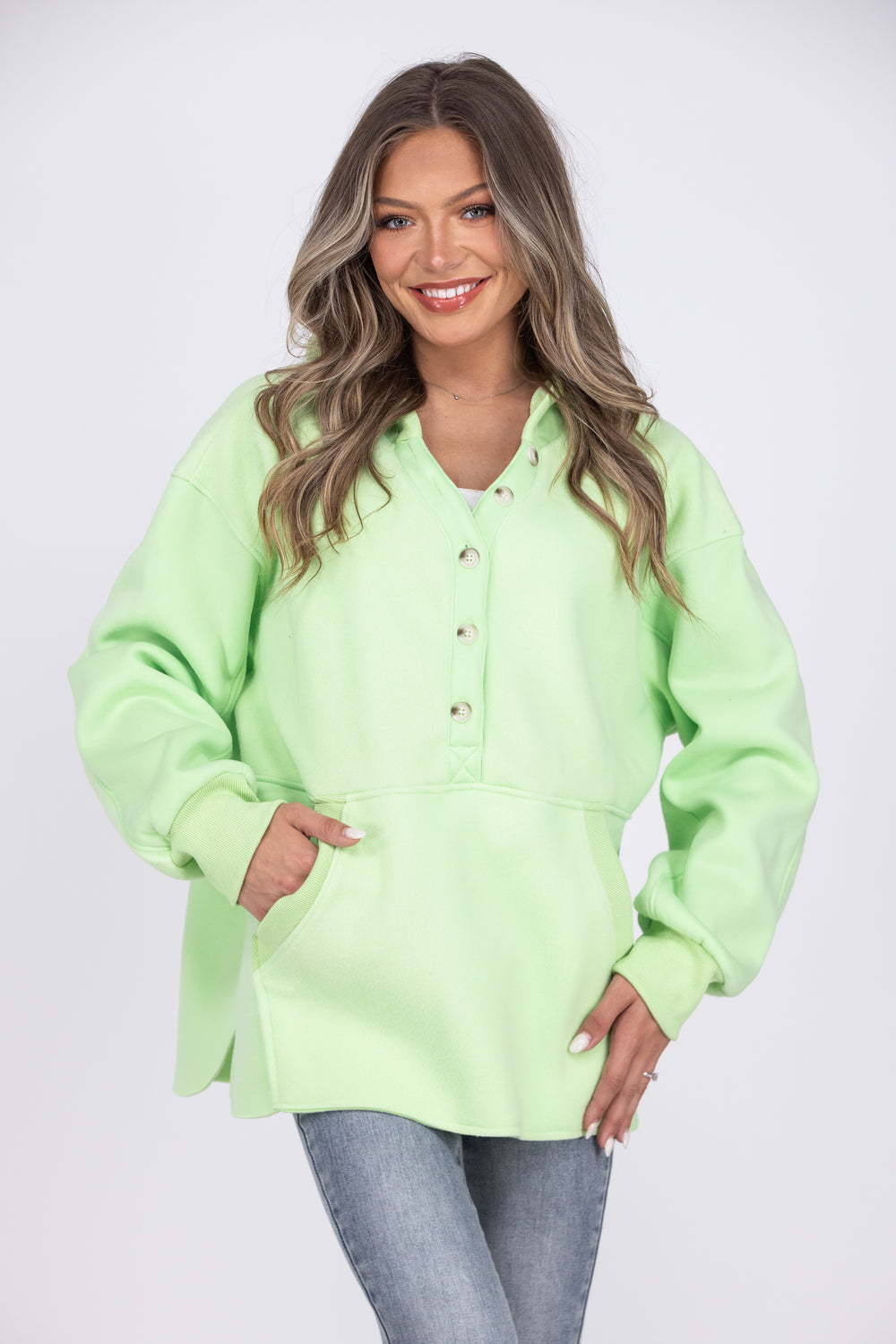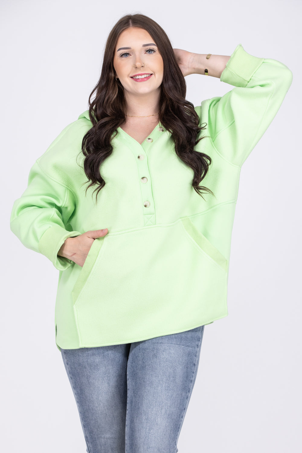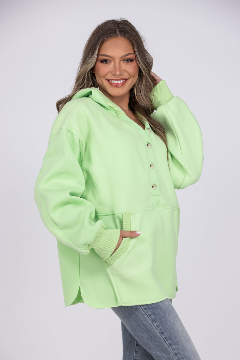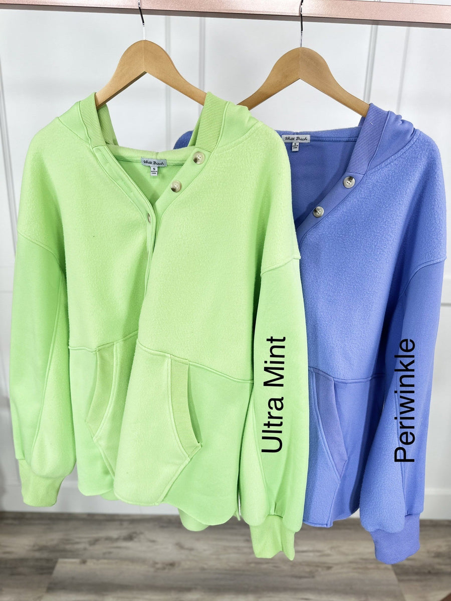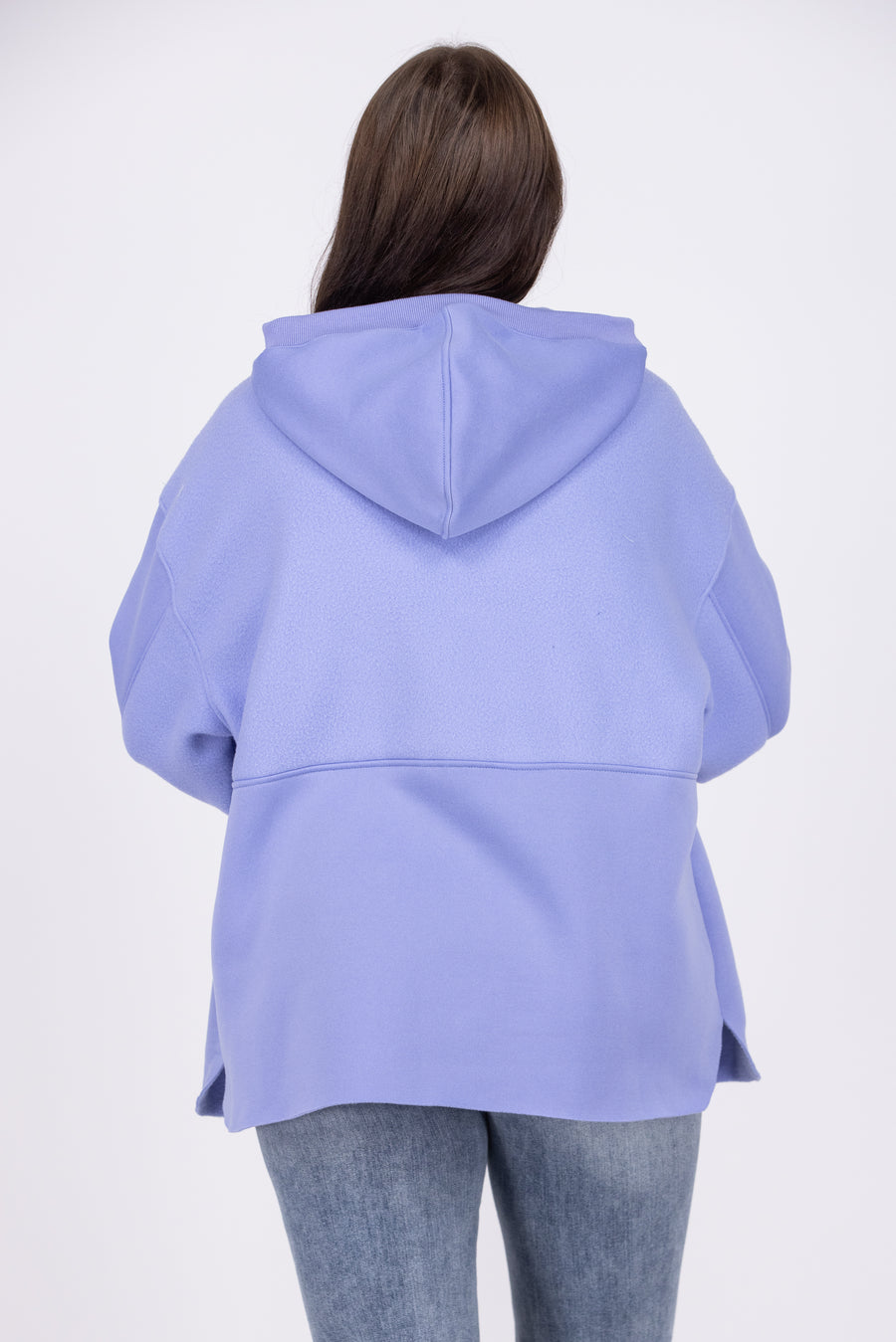 Get in the mood to lounge around and stay in for the night, in The Nights In Hoodie from White Birch. It features long sleeves, V neckline, 1/2 button down front detail, front pouch pocket, hood, contrasting fabrics and mini side slits. The fabric is a lightweight fleece knit. It is perfect for running errands or just lounging around the house. Pair with your favorite leggings, our "Nights In Joggers", or denim and our "Luna Sneaker" for a cozy look!