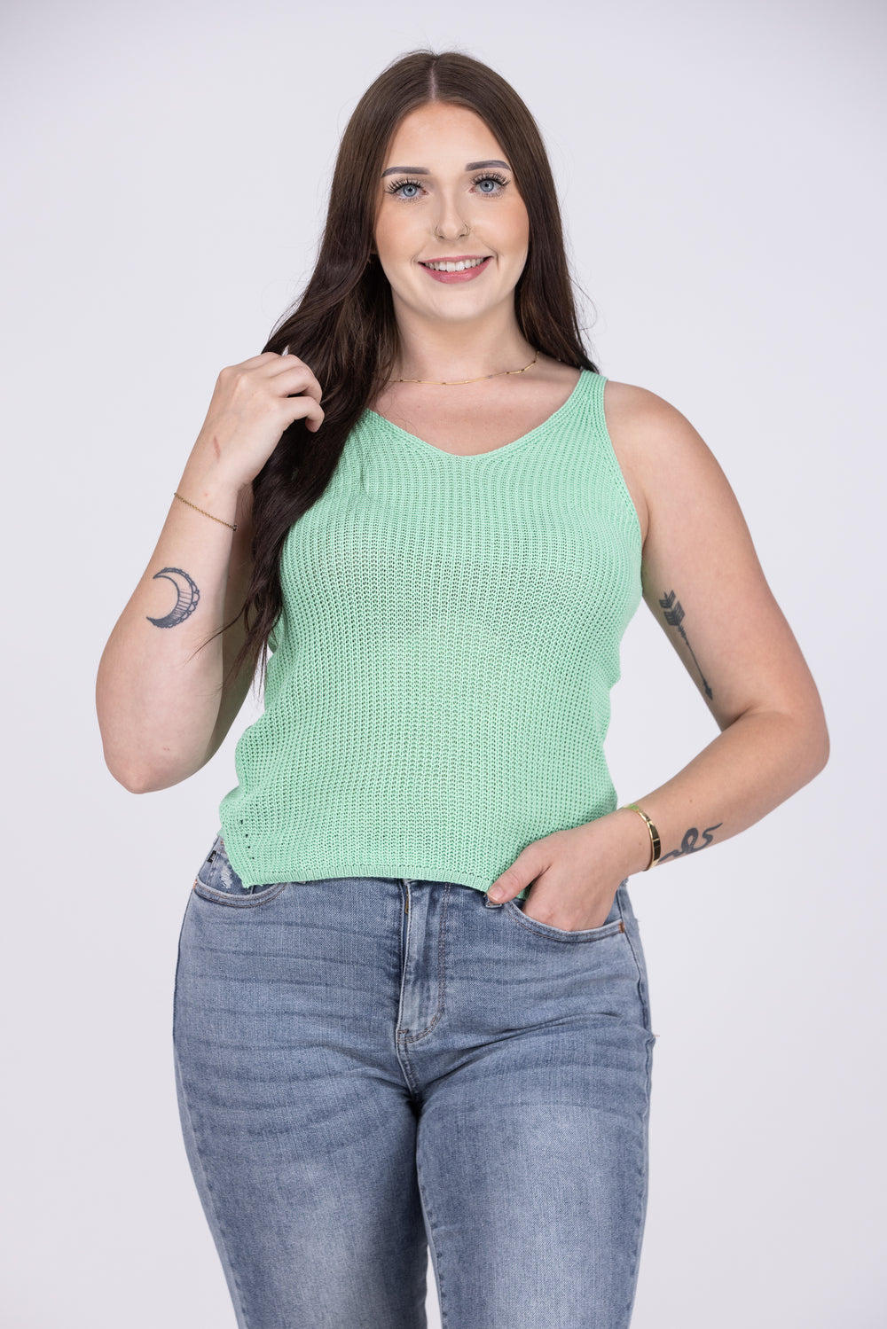 The One More Try Top by Ee:some is a V-neck knit tank top with a slight cut out detail on each side. An effortless piece to wear any day.