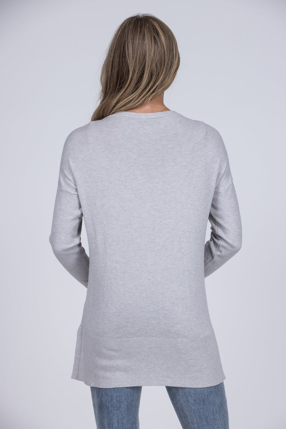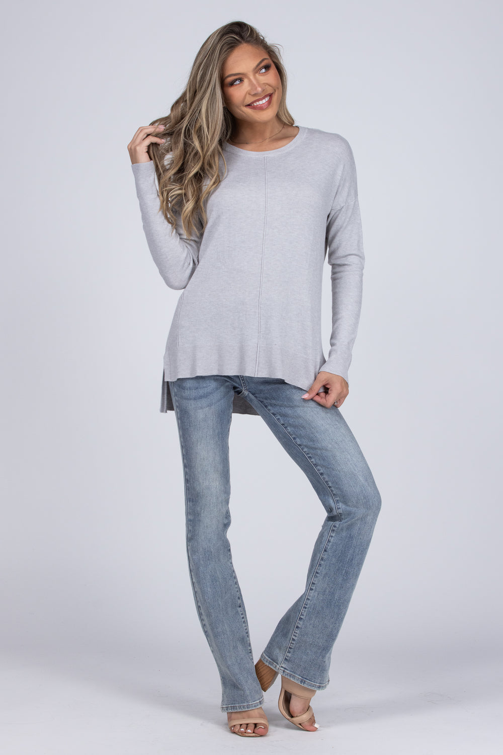 The Open Eyes Top by Cozy Casual is a soft knit sweater with an exposed center seam and ribbed side details. Features long sleeves, a rounded neckline, and a hi-lo hemline with side slits. Lightweight top with lots of stretch. This top pairs great with denim.