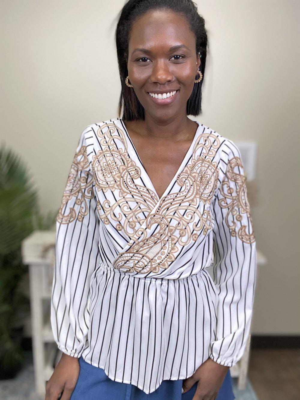 Out With Friends Top by Savanna Jane is a stylish surplice top with long sleeves & elastic on the waistline to give you the best shape ever! We love the tonal embroidery design on this striped pattern top! Non sheer, woven.