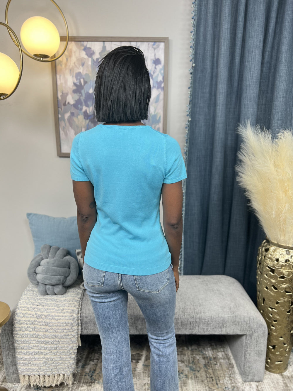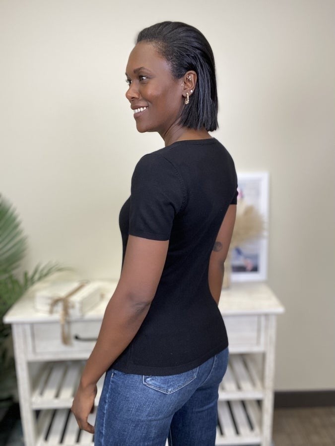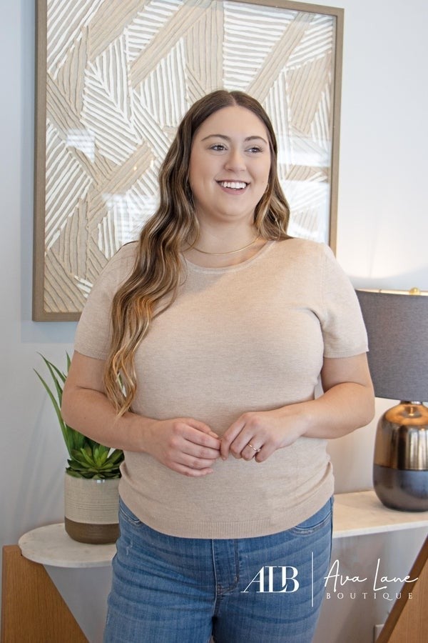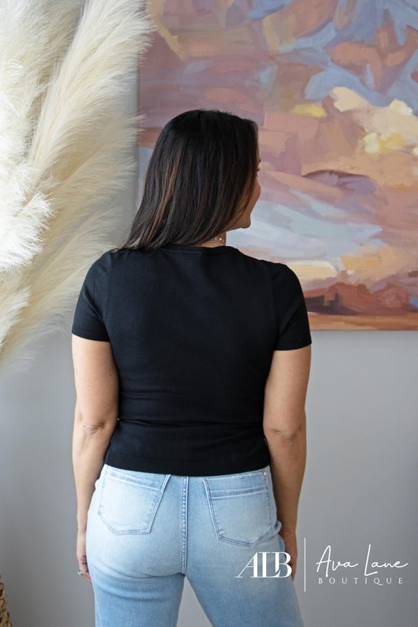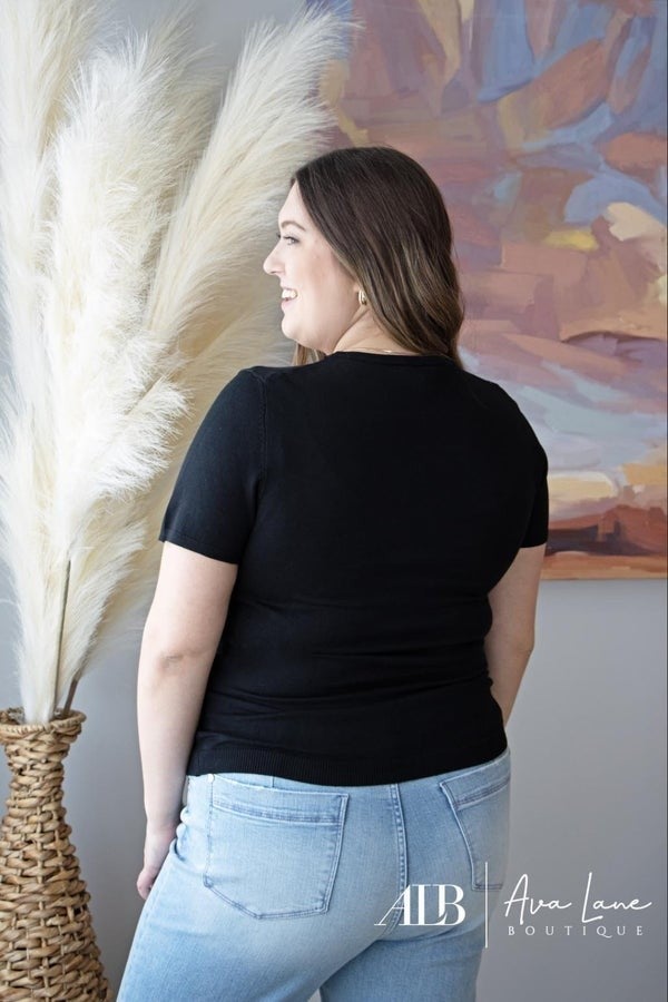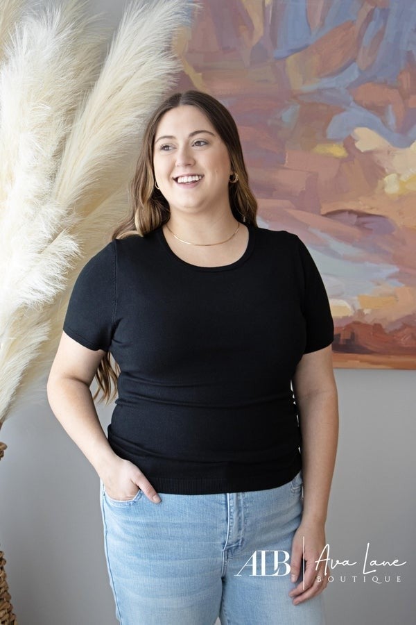The Pay It Forward Top is a ribbed short sleeve sweater designed to hug and cradle your figure for the most flattering look while comfortable in arms. Super soft knit with a smooth finish, slim silhouette with a stretchy fit. Goes great with denim.