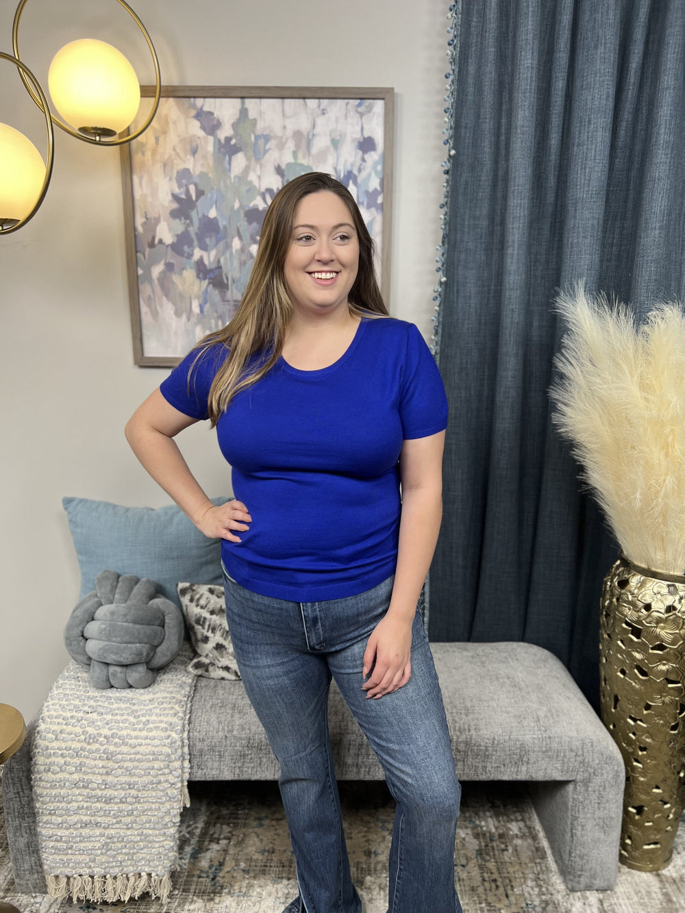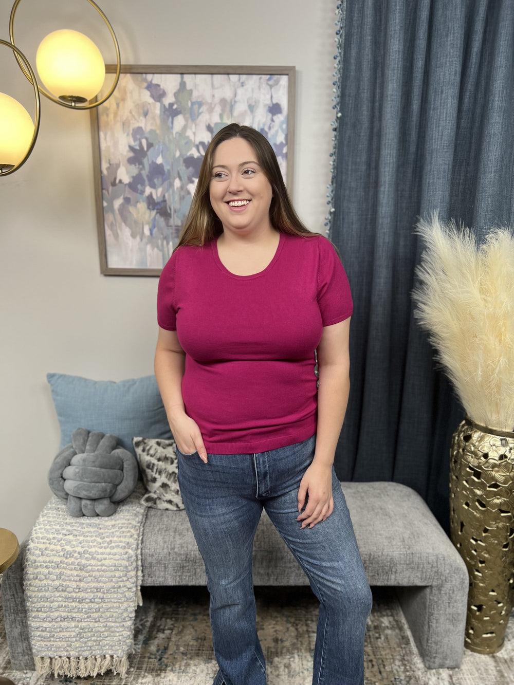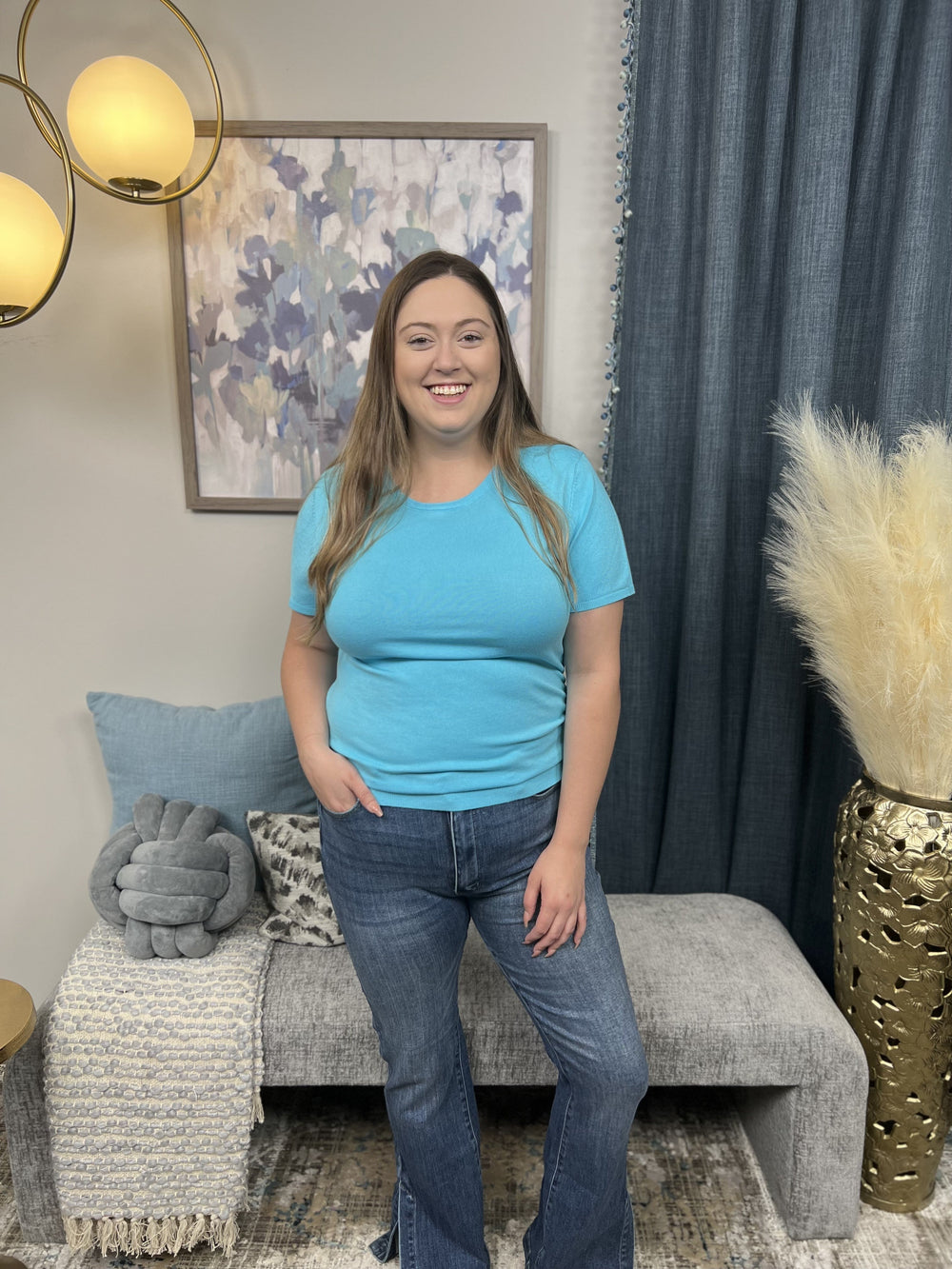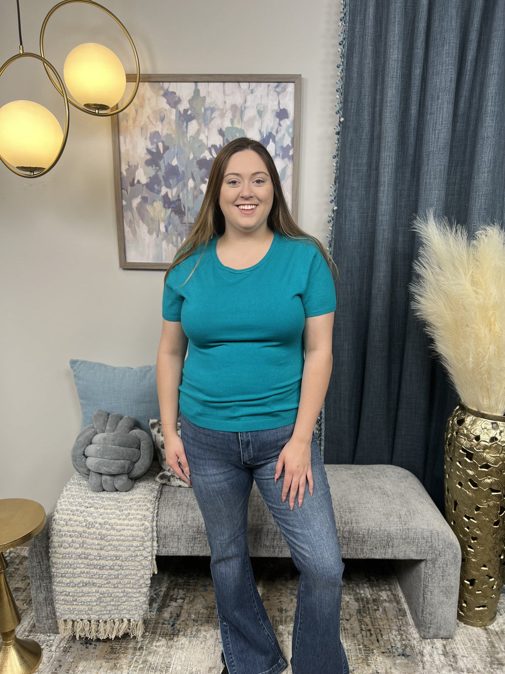 The Pay It Forward Top is a ribbed short sleeve sweater designed to hug and cradle your figure for the most flattering look while comfortable in arms. Super soft knit with a smooth finish, slim silhouette with a stretchy fit. Goes great with denim.