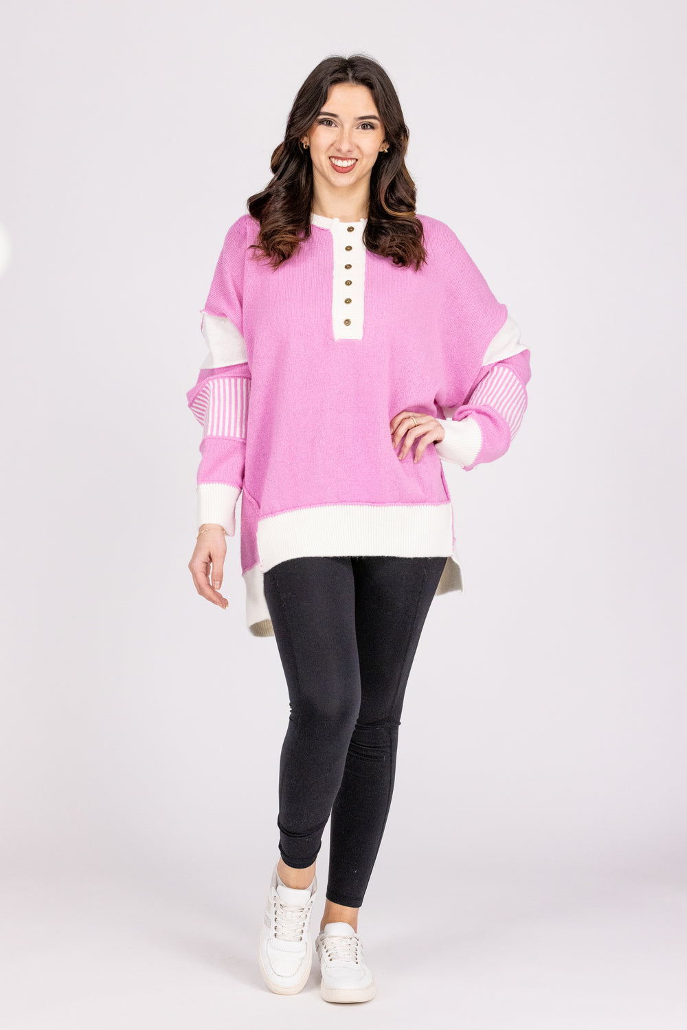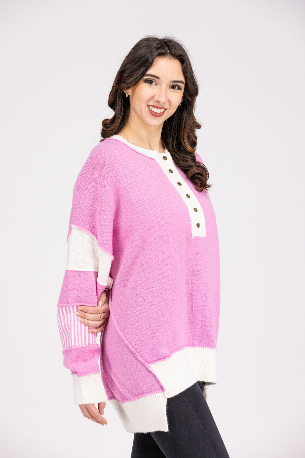 Fall in love with this Peach Love Cupid's Heart Women's Sweater! Featuring a 1/4 button down and a unique step hem with reversed stitch detail, this sweater is both stylish and comfortable. Perfect for any casual day out or cozy night in.