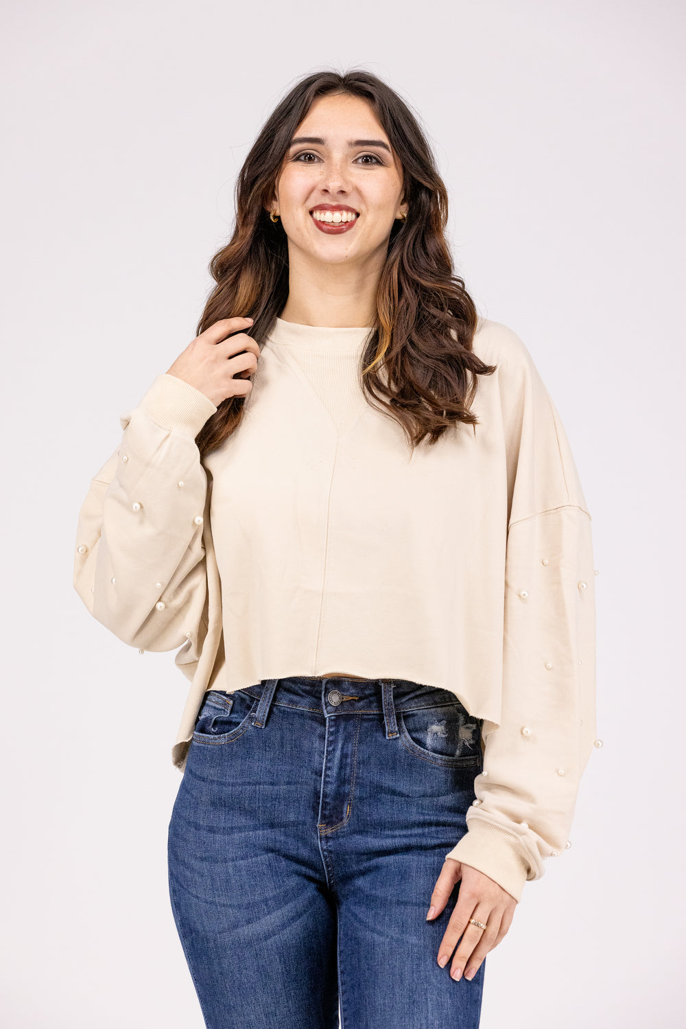 Get wise with our Pearl of Wisdom Cropped Sweatshirt from Peach Love. This playful piece features pearl embellishments along the arms for an unexpected touch of glamour. With a round neckline and cropped raw cut hem, this quirky sweatshirt is perfect for adding some fun to your wardrobe. Grab yours before they're gone!