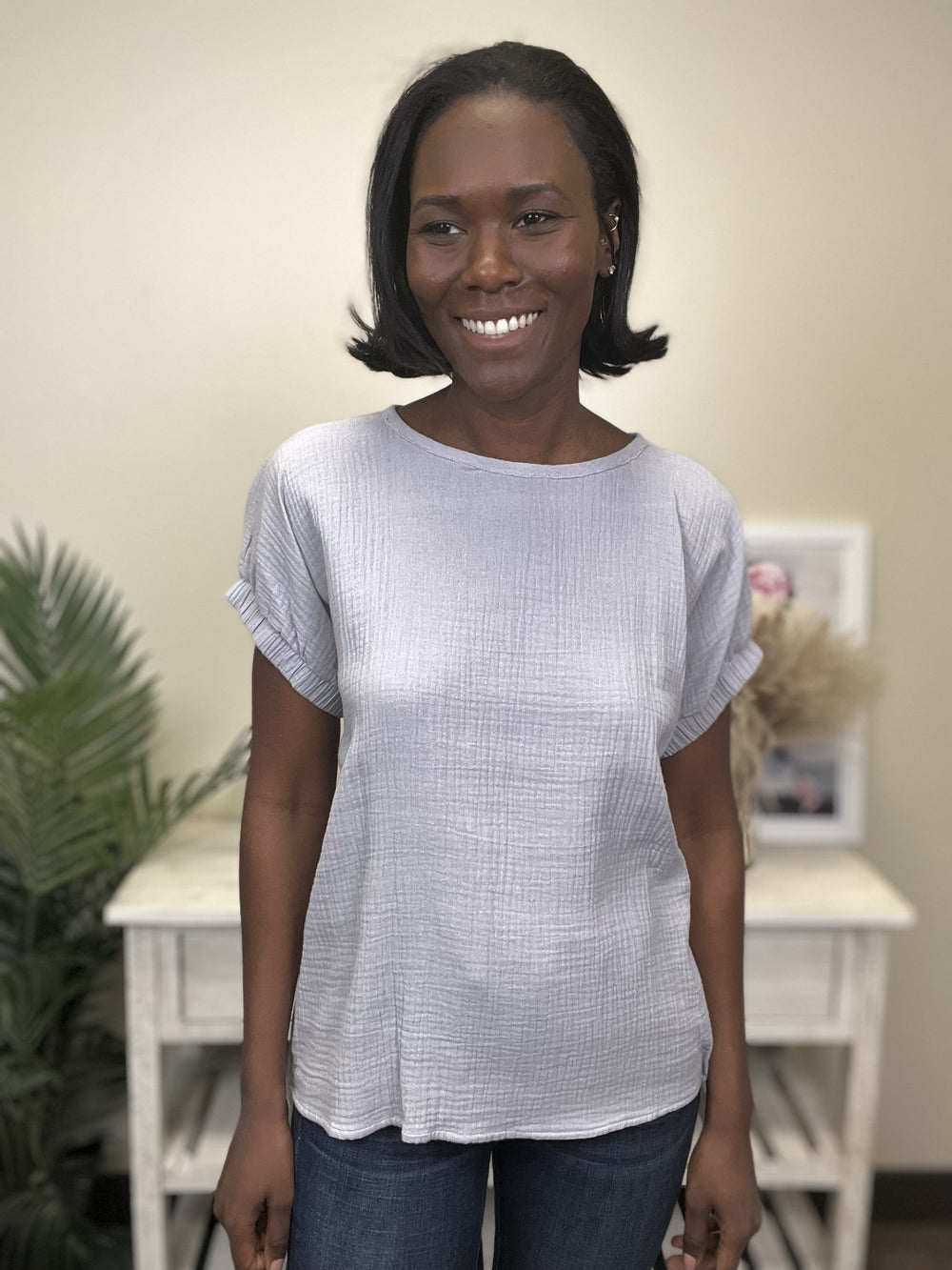 The Peekaboo Buttons Top by Doe & Rae is made of super soft cotton featuring a round neck, boxy fit elastic banded short dolman sleeves and a button down back.