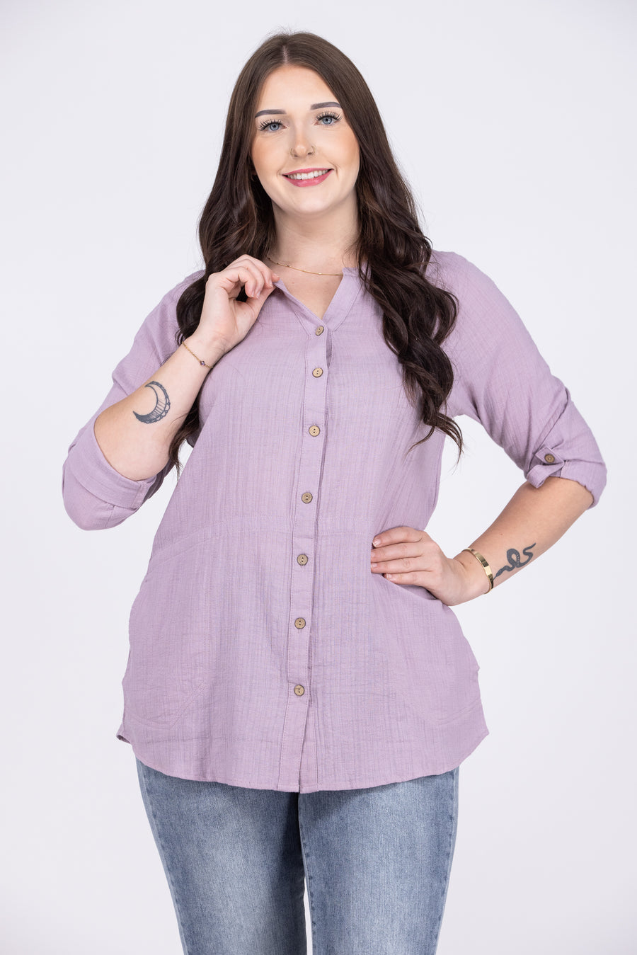 The Perfect Vision Top by Be Cool is a slightly oversized cotton button down shirt. It features a mandarin collar and wooden buttons for a natural detail, long sleeves with button cuff and side pockets. Pair with some black or white denim and sandals!