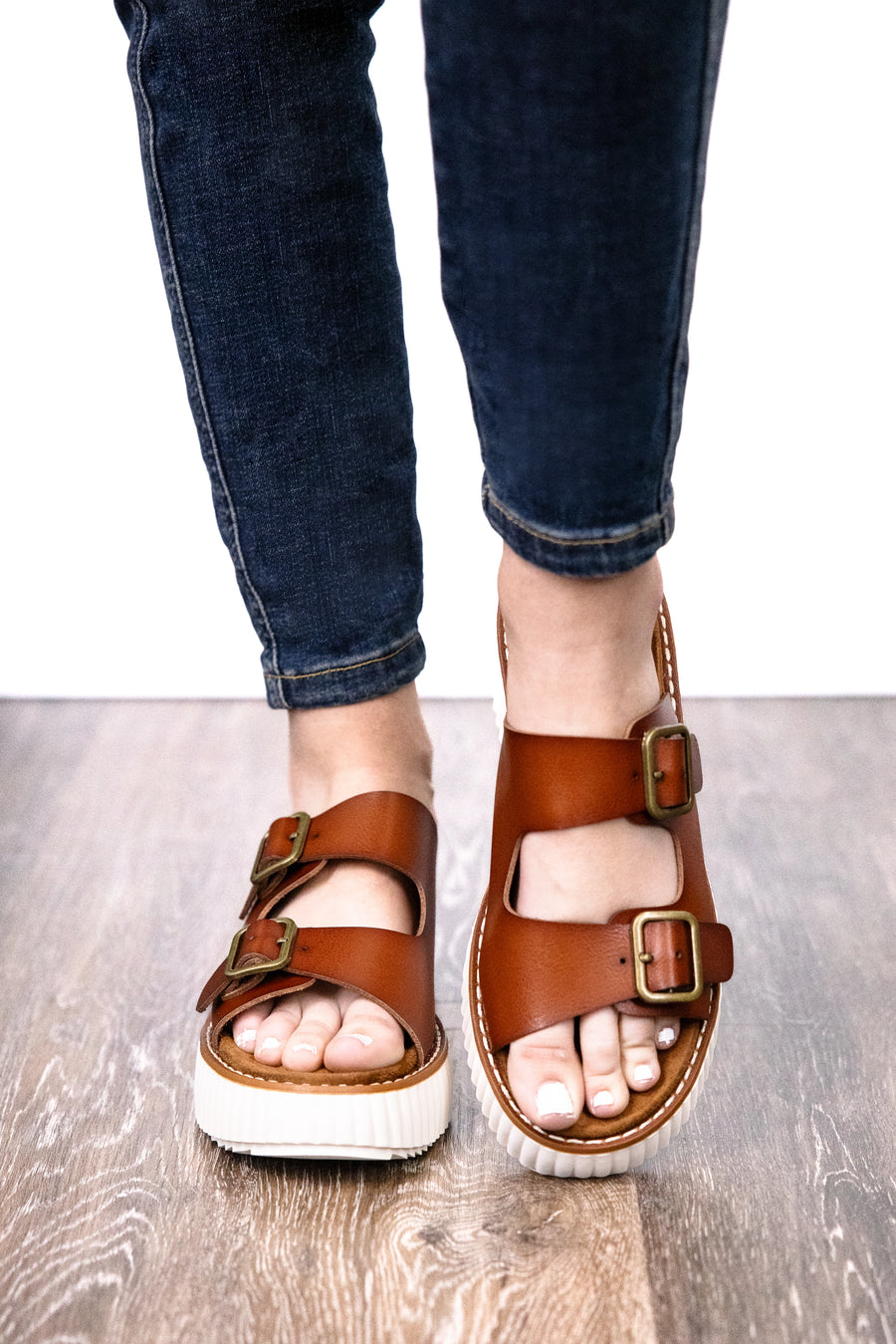 Slip into sweet style with Pierre Dumas Sweet Duo Sandals. These faux leather sandals feature two functioning buckles for a comfortable and secure fit, a rounded toe for added style, and a chunky platform sole for a touch of height. Perfect for any casual outfit, these sandals will be your new go-to!