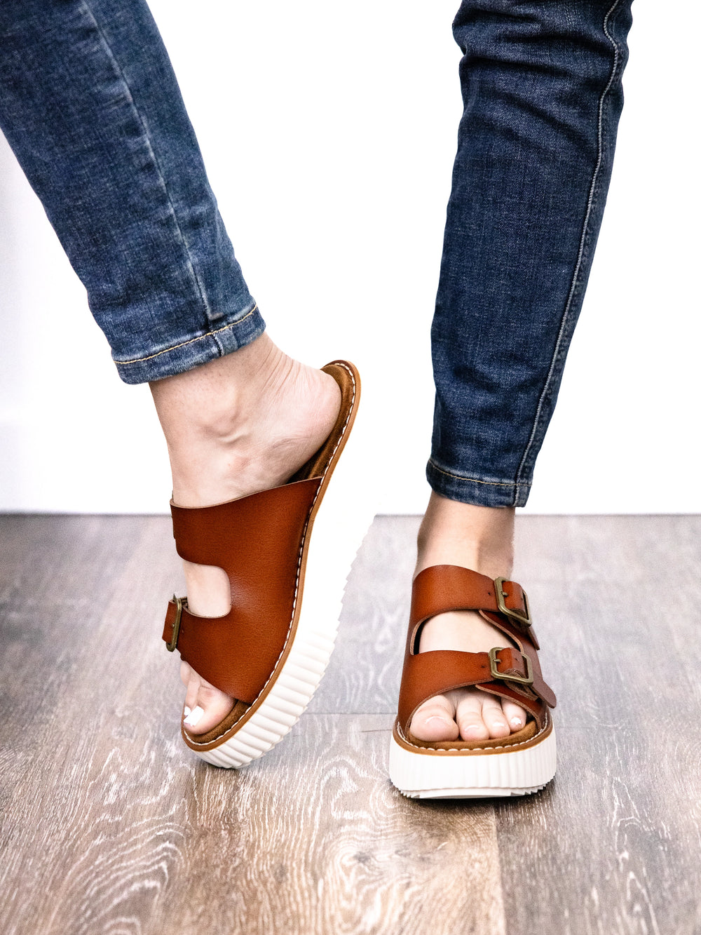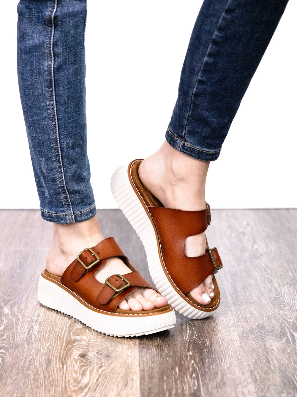 Slip into sweet style with Pierre Dumas Sweet Duo Sandals. These faux leather sandals feature two functioning buckles for a comfortable and secure fit, a rounded toe for added style, and a chunky platform sole for a touch of height. Perfect for any casual outfit, these sandals will be your new go-to!