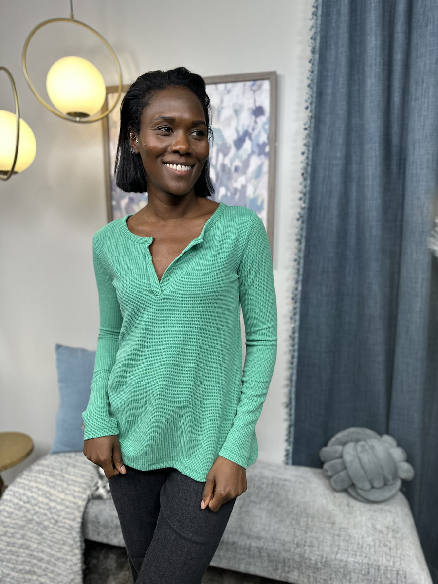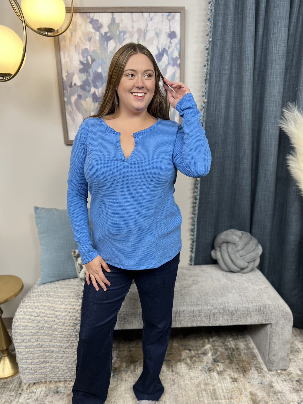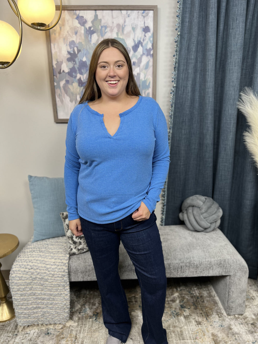 This top will have you playing your cards right! This stylish top from Zenana features waffle knit fabric and a rounded neckline with a V-neck split. Perfect for layering under a t-shirt to add more depth to your outfit or to pair on it's own with denim!