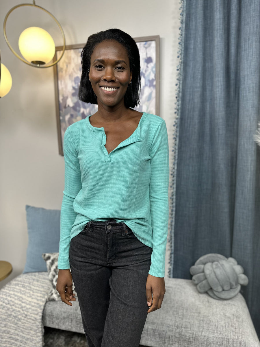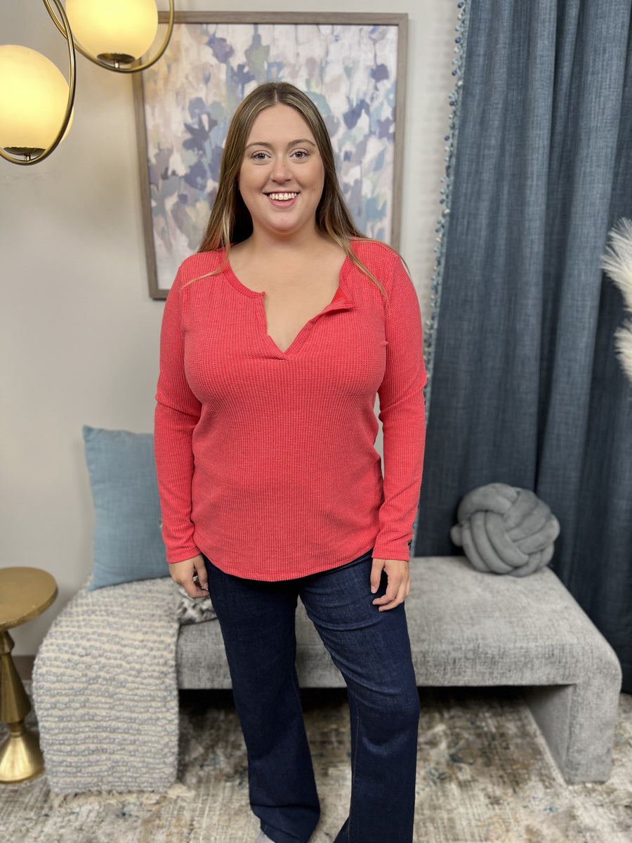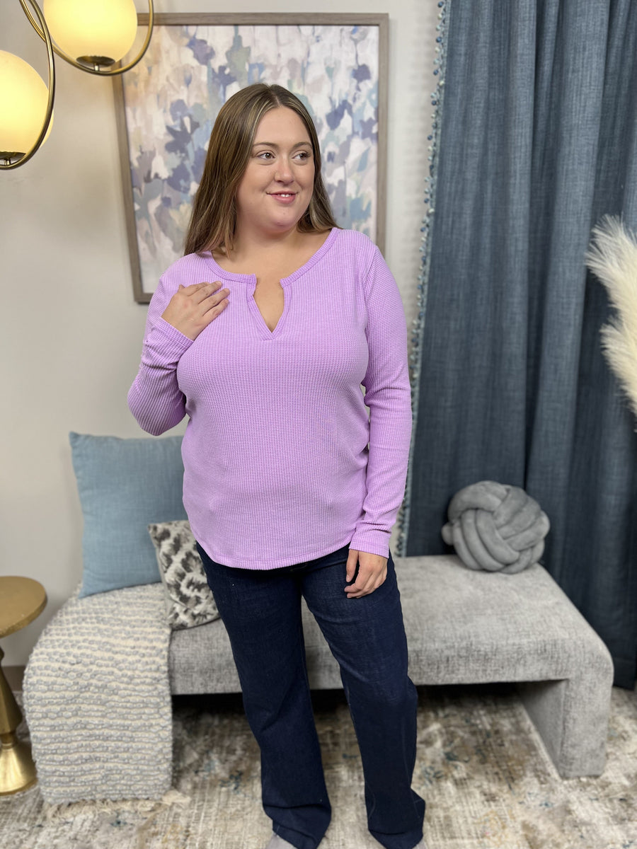 This top will have you playing your cards right! This stylish top from Zenana features waffle knit fabric and a rounded neckline with a V-neck split. Perfect for layering under a t-shirt to add more depth to your outfit or to pair on it's own with denim!