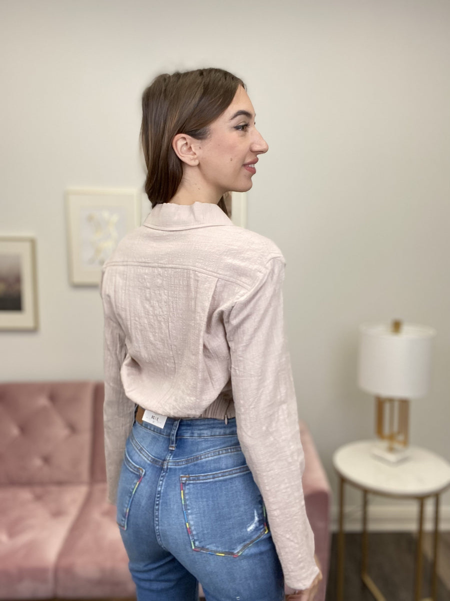 The Popular To Boot Top By Fanco is a solid woven cotton top. It features long bell sleeves, collared neckline, twisted front, side zipper detailing and an elastic back of waist. It offers a true to size cropped fit and will pair perfectly with some linen shorts or high waisted denim!