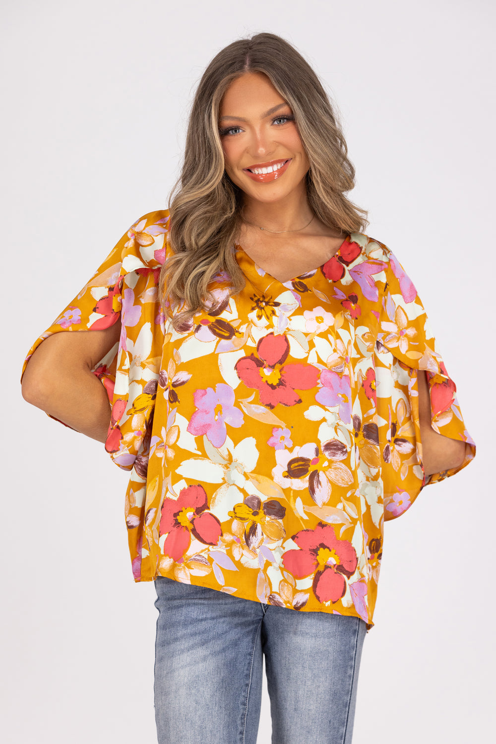 Bask in the beautiful rays of sunlight with the Pretty Pretty Sunshine Top from Andree by Unit! This top features butterfly sleeves, colorful floral patterns, a V neckline, and a relaxed true to size fit. Pair with denim and feel the sun's glow!