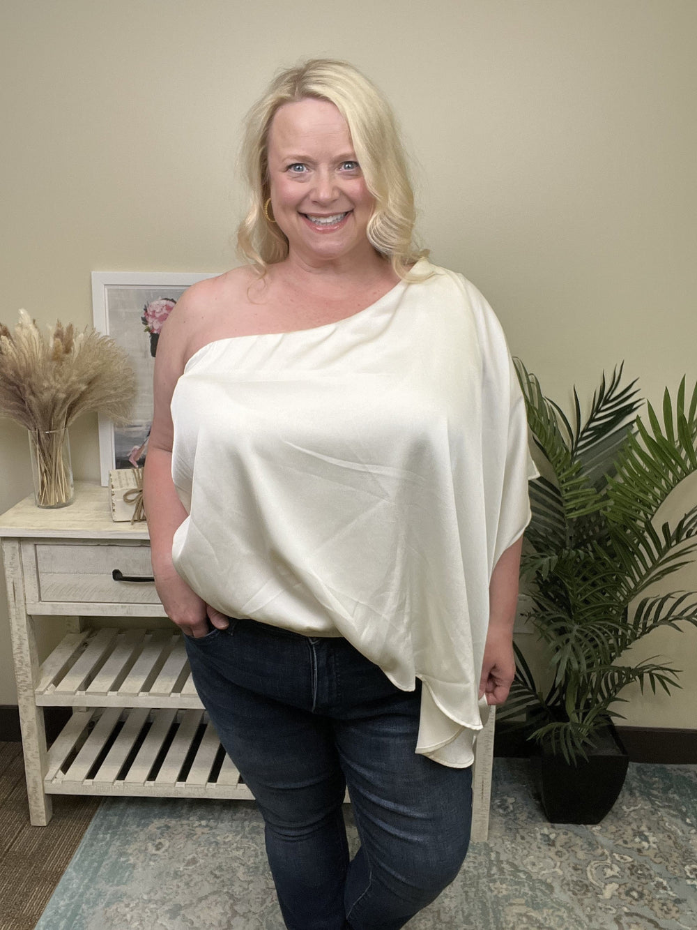 The Prove Them Wrong Top by Kori will definitely prove all those haters wrong! This sassy and classy top features a one shoulder neckline, an elastic puff hemline, and a waterfall style sleeve. The fabric is super silky and has a great skin feel! Pair this with some dress leggings and heels for a classy date night outfit!