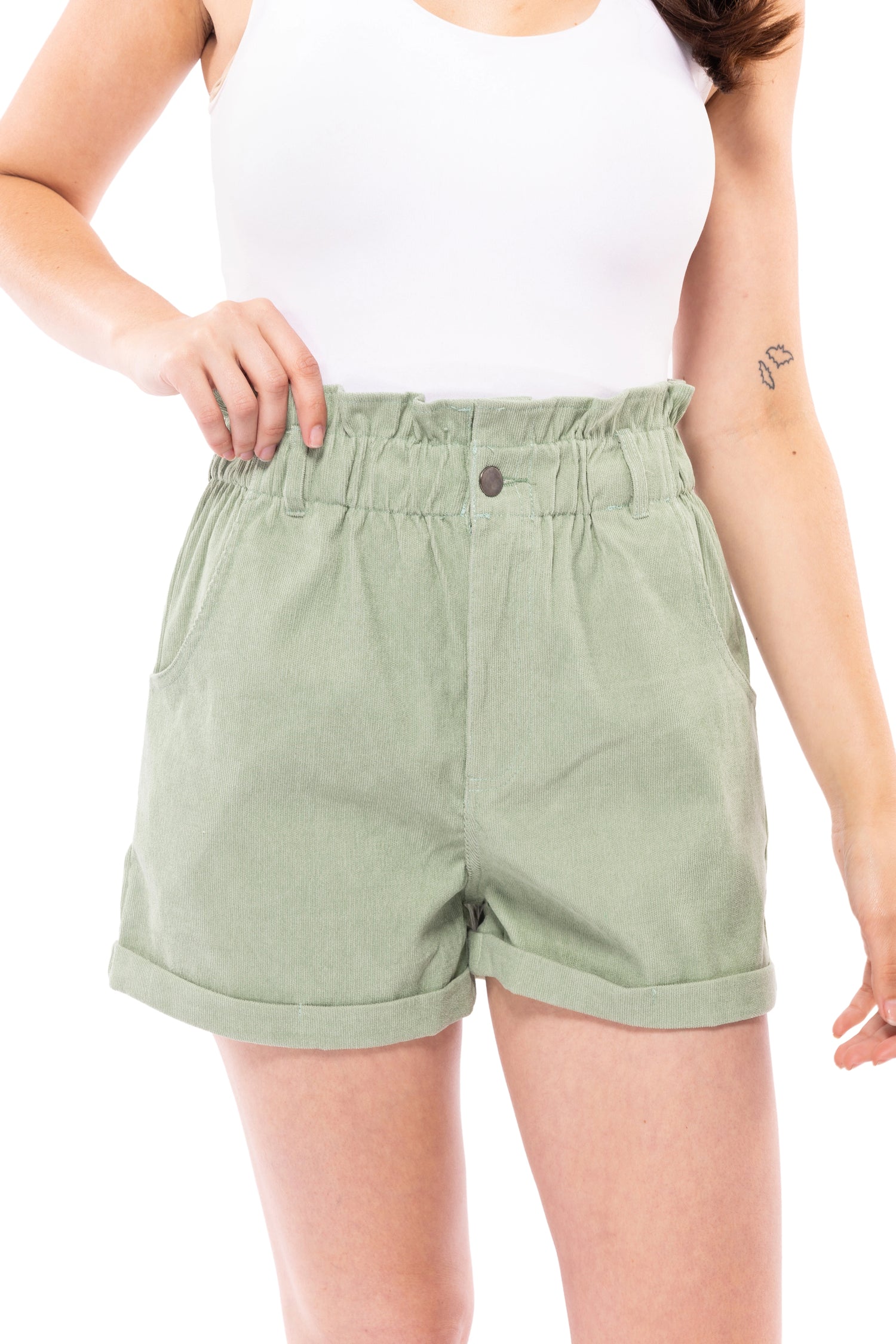 The Put On A Show Shorts By Fanco are a solid pair of high waisted corduroy shorts. They feature a cuffed hem, pockets, button and zipper closure and a cute elastic waistband. Pair with a cute tucked in tee or bodysuit to see the fun cinched waist band!