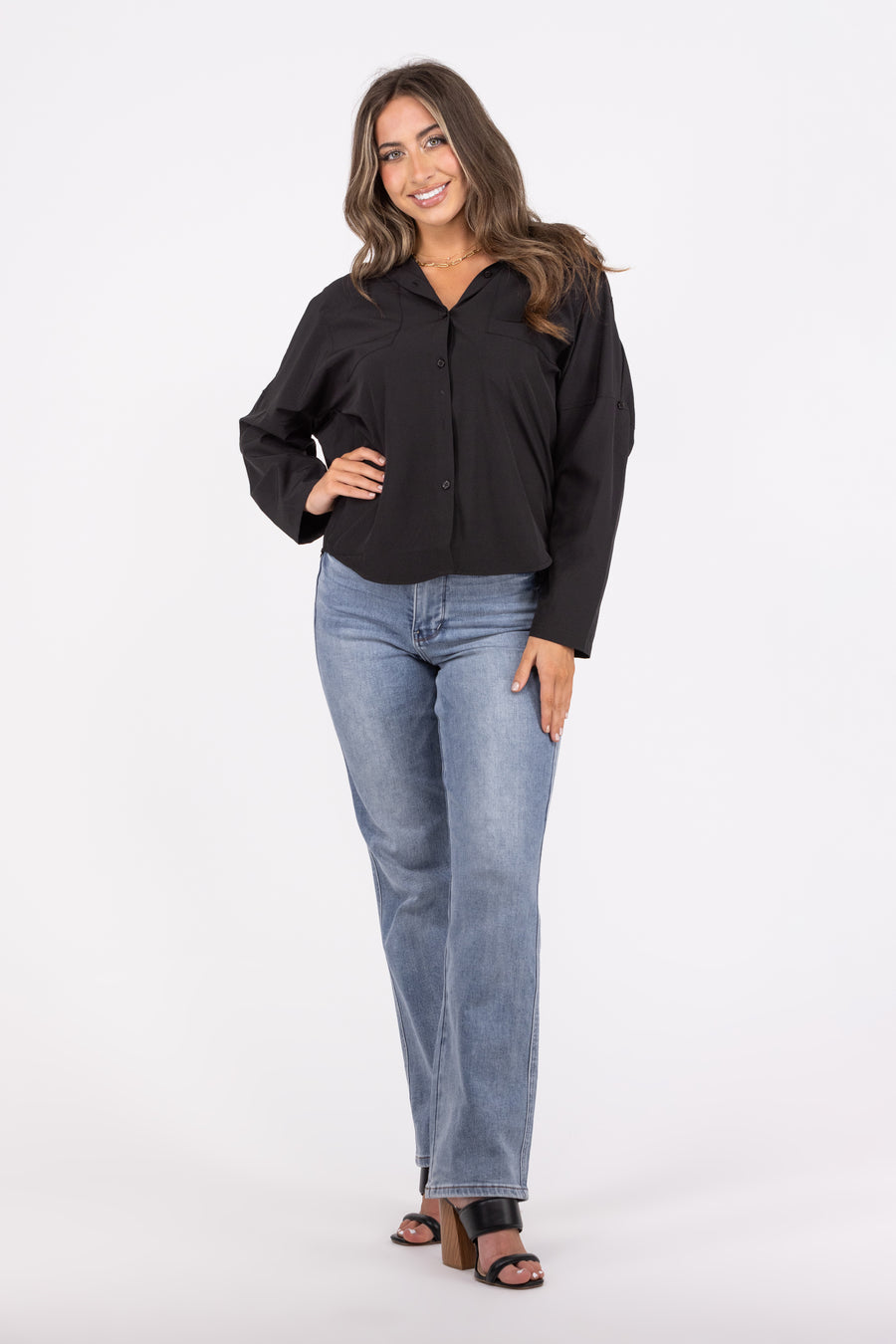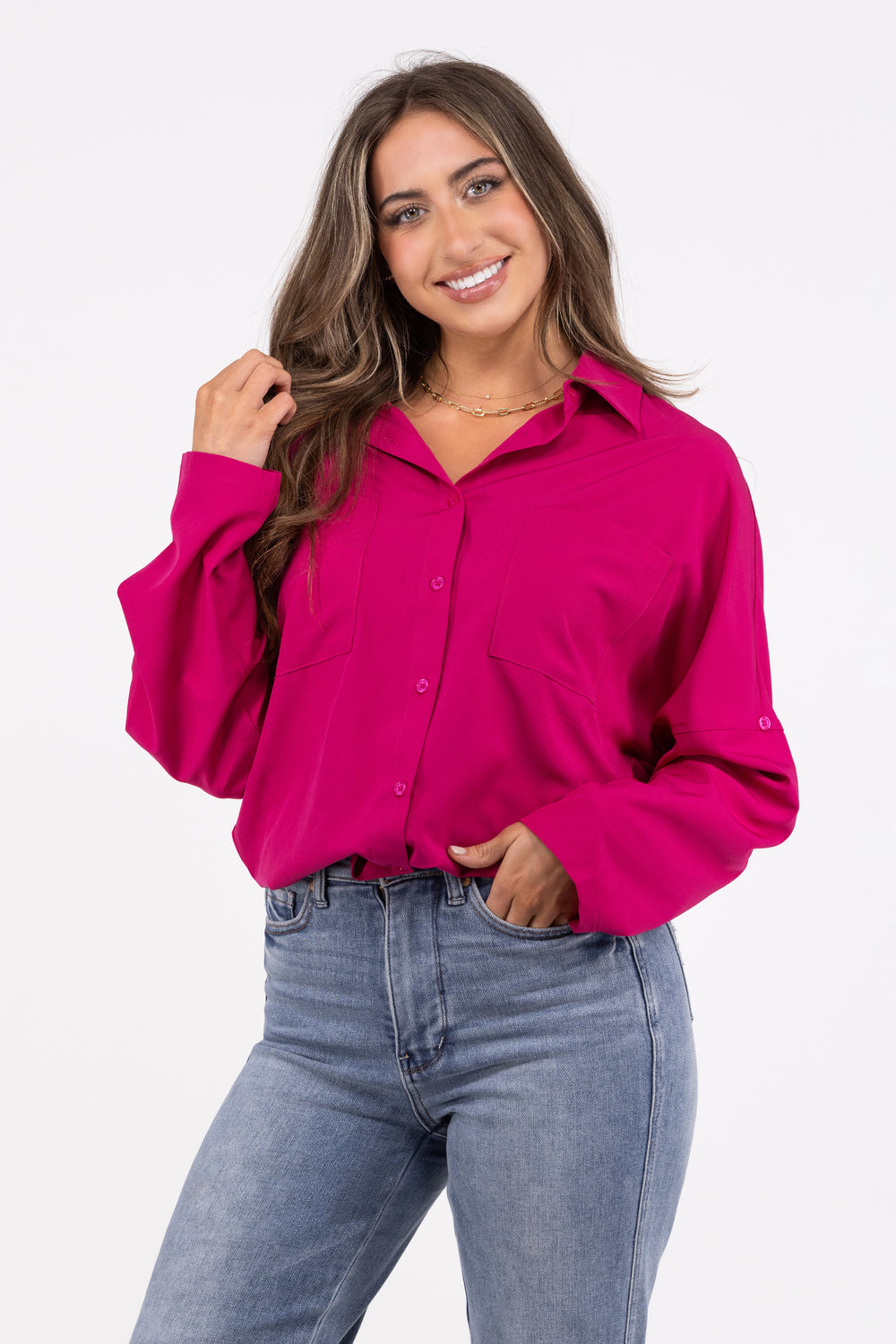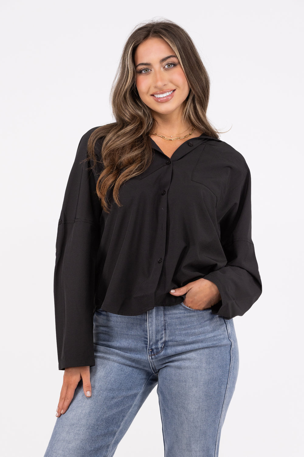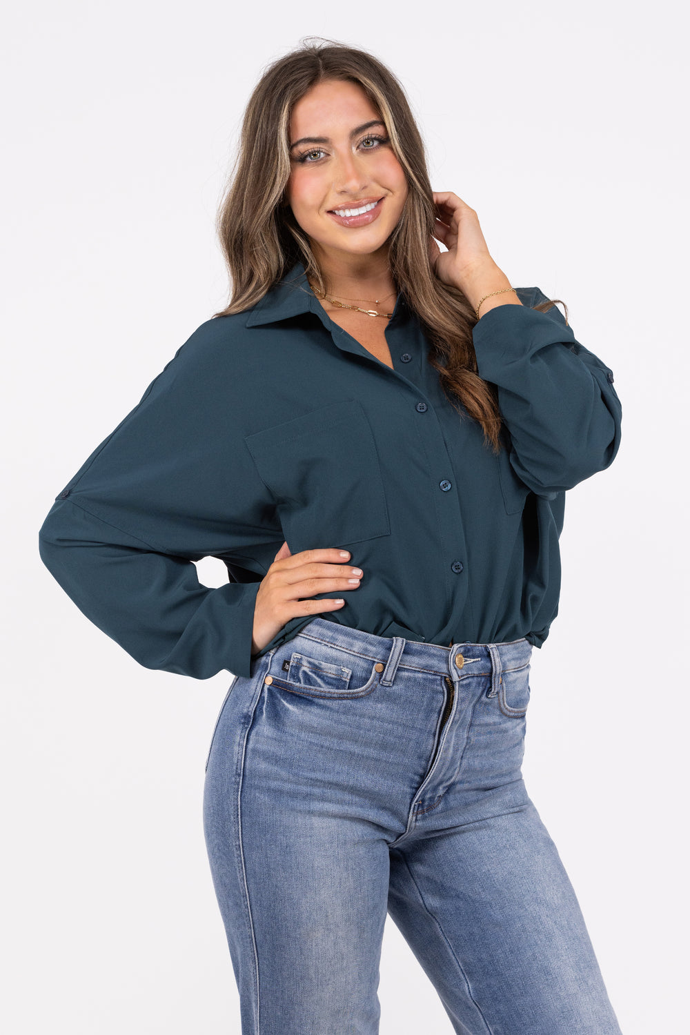 Work hard, play hard in the Putting In Work Top from Andree by Unit. This top features a button up front, quarter sleeve button up cuffs, two chest pockets, a hi-lo hemline, and a collar. The top is versatile and stylish, with a classic and trendy vibe. You can wear this top with pants, or skirts for a professional and polished look. Whether you're heading to the office, a meeting, or a lunch date, this top will keep you classy and confident.