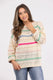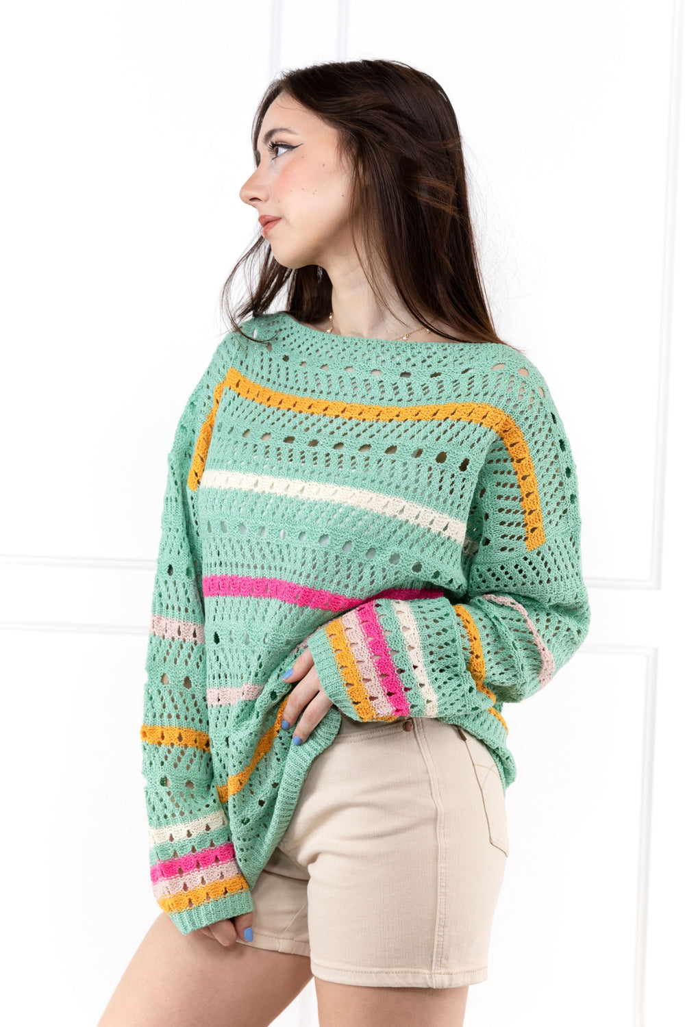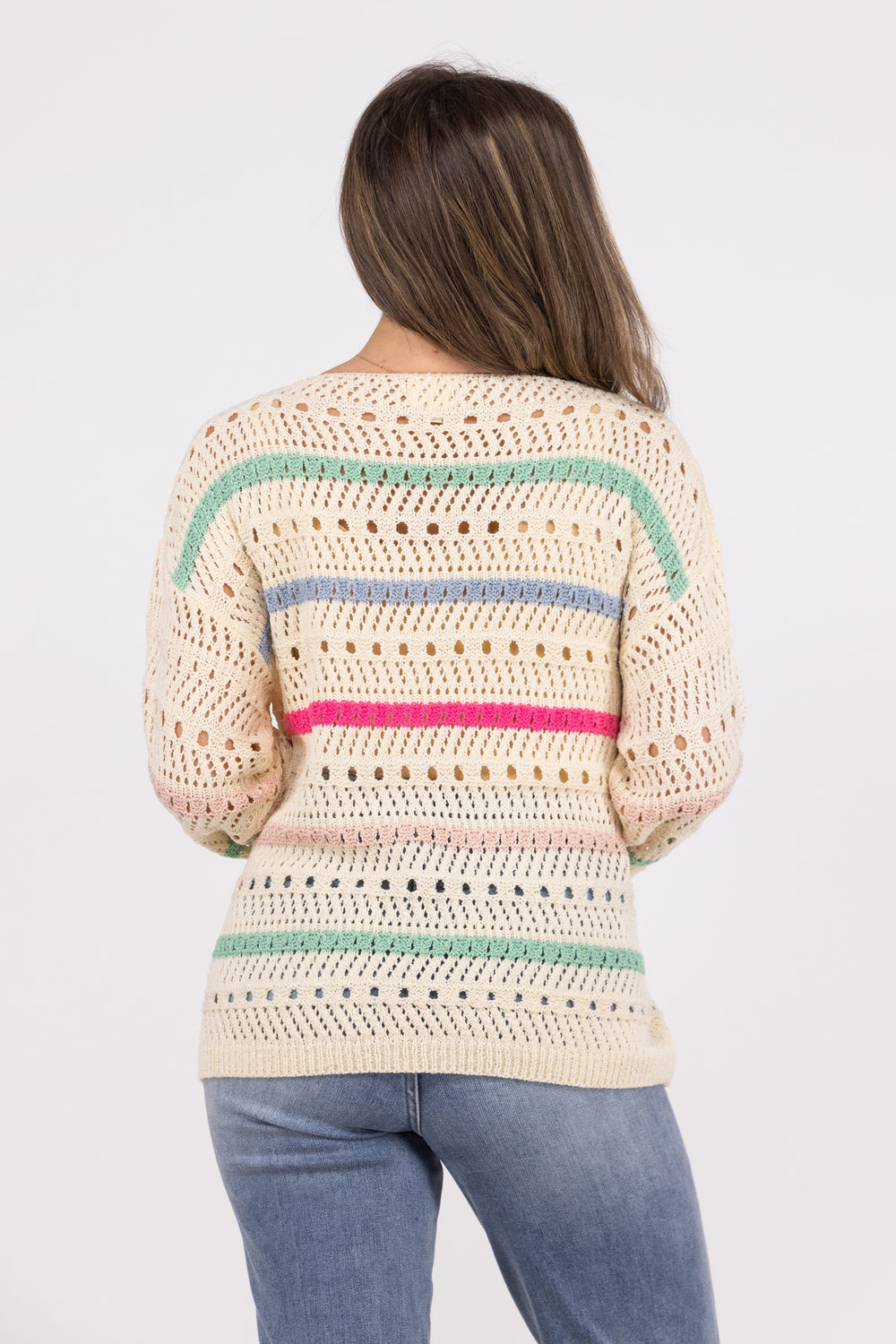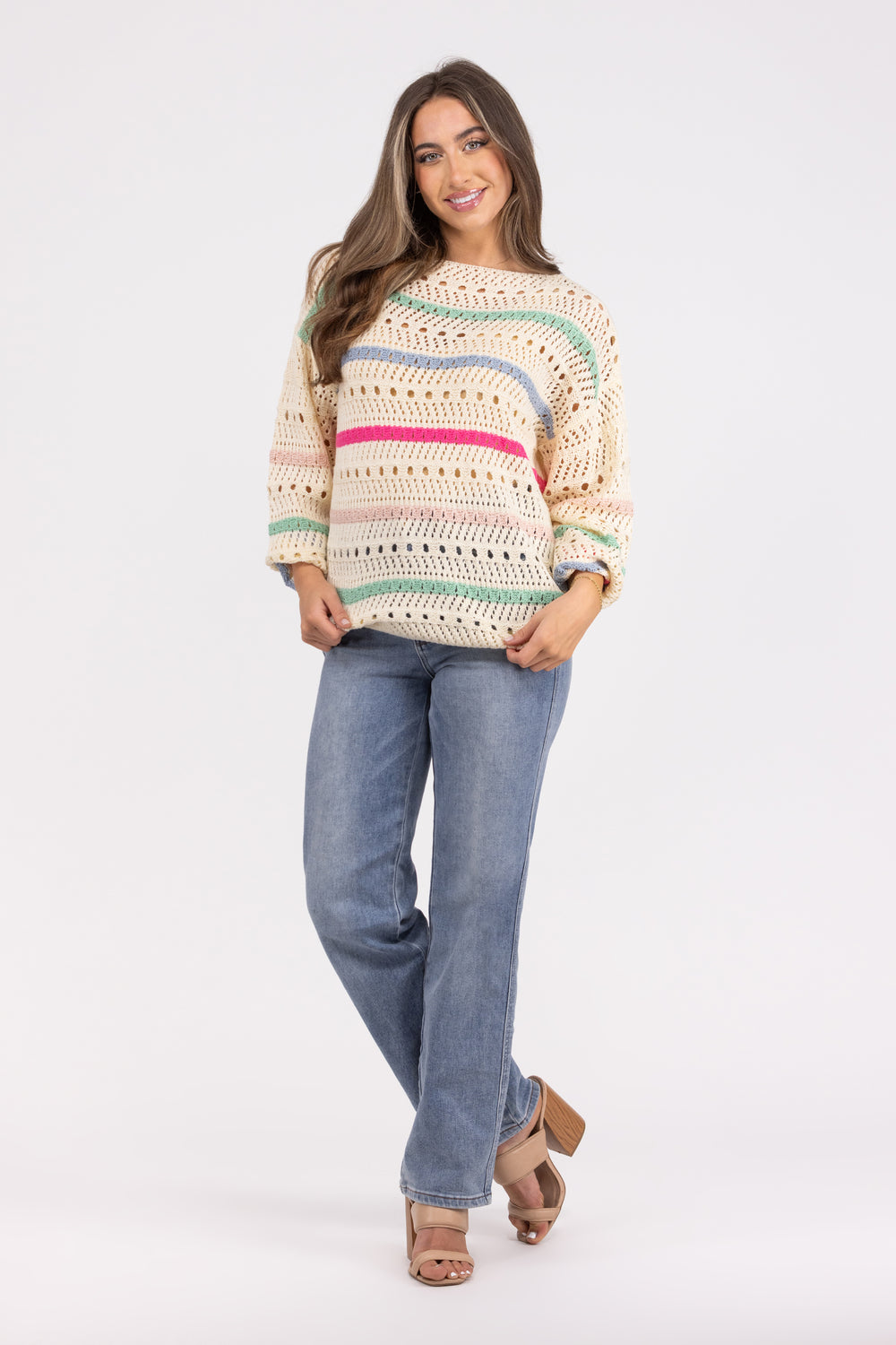 The Rainbow Sherbert Sweater from Bibi features stretchy, chunky, knit with colorful stripes and a stylish rounded neck. Perfect for using as a swimsuit coverup or layering over your favorite cami!