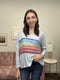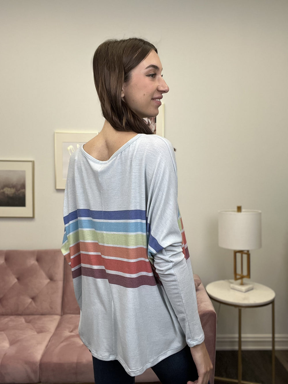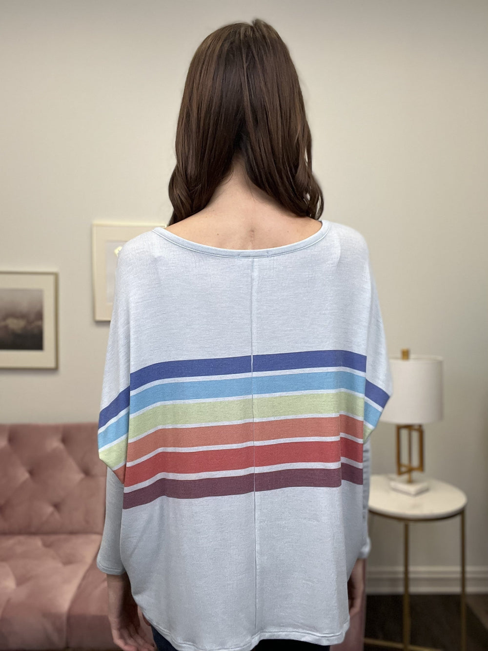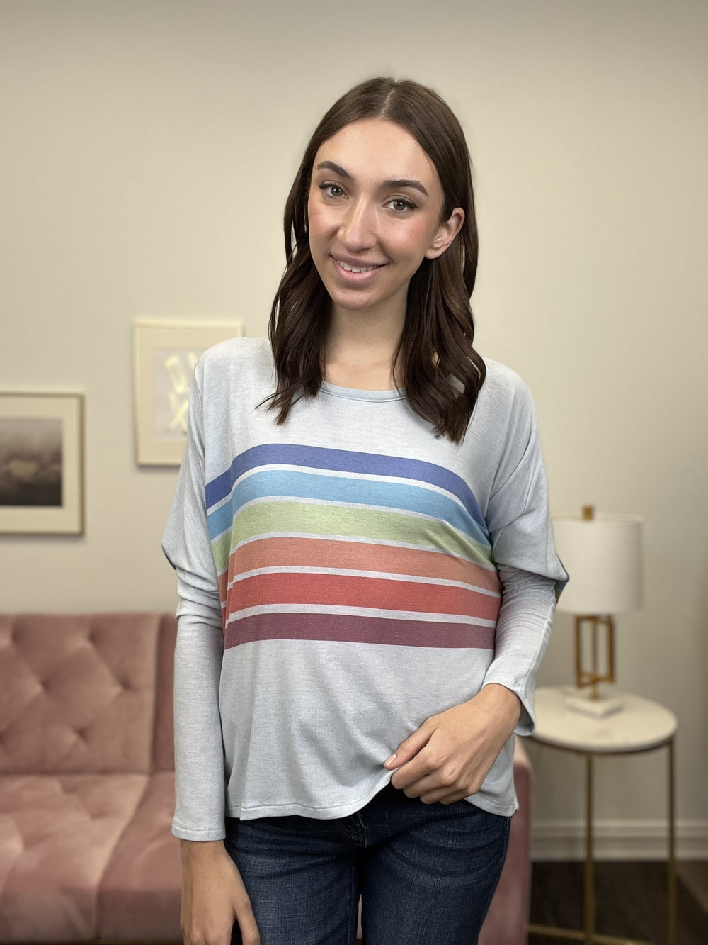 The Rainbow Sunshine Top by Enti Clothing is a rainbow striped top. It features a lightweight ribbed material, dolman 3/4 sleeves, crewneck line and straight hemline. You will love the rainbow sunshine top with its relaxed comfy fit!