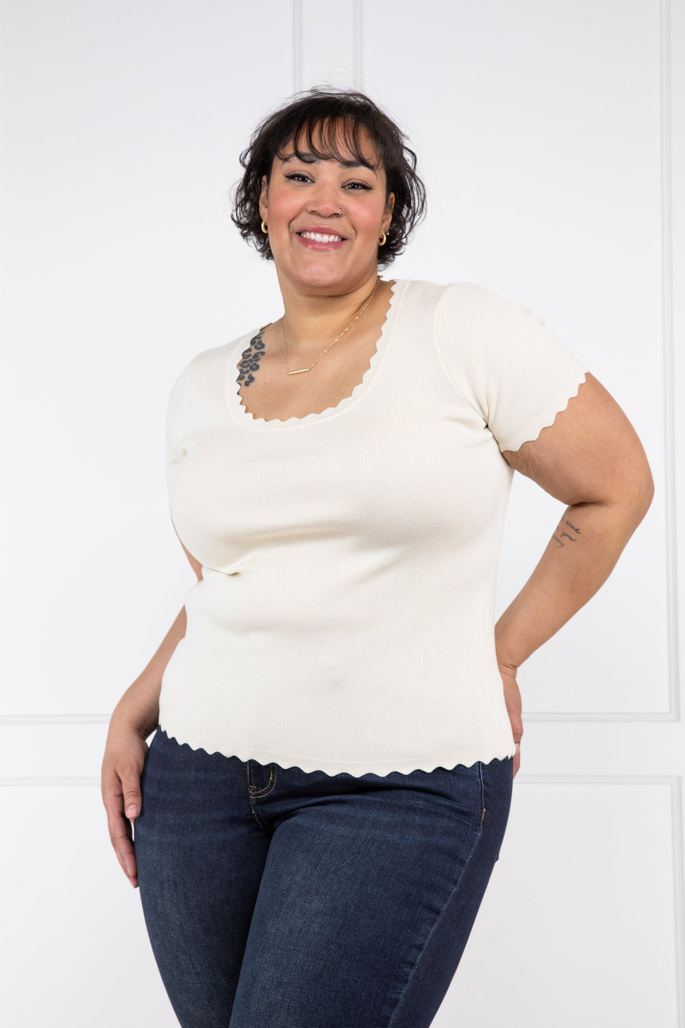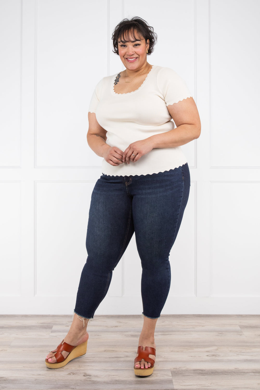 The Ray of Sunshine Sweater Knit Top will have you glowing! This top features scalloped edged on the hem, neckline, and arms. It pairs perfectly with a pair of Skinny Jeans, Shorts, or a Skirt!