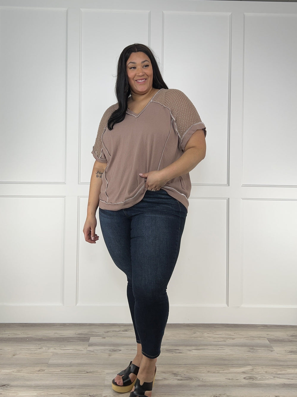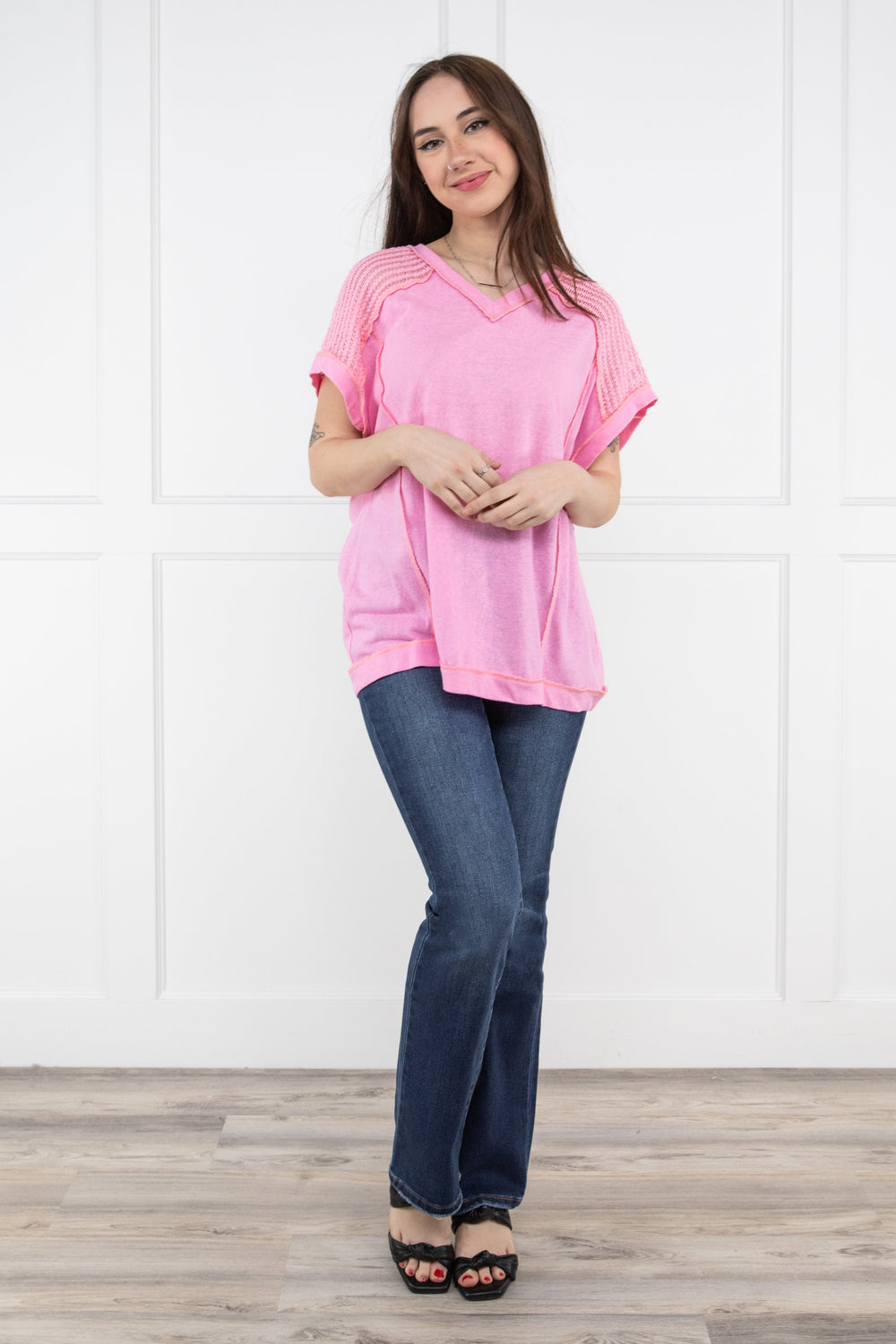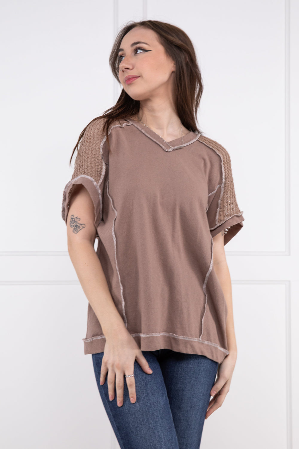 The Relax With Me Top from Andree By Unit will have you feeling stylish but comfortable all day. It features a V-neckline, overlock edge details, dolman short sleeves, and knit details on both shoulders. Pair it with your favorite lounge bottoms, wide leg denim, or denim shorts and sneakers or sandals.